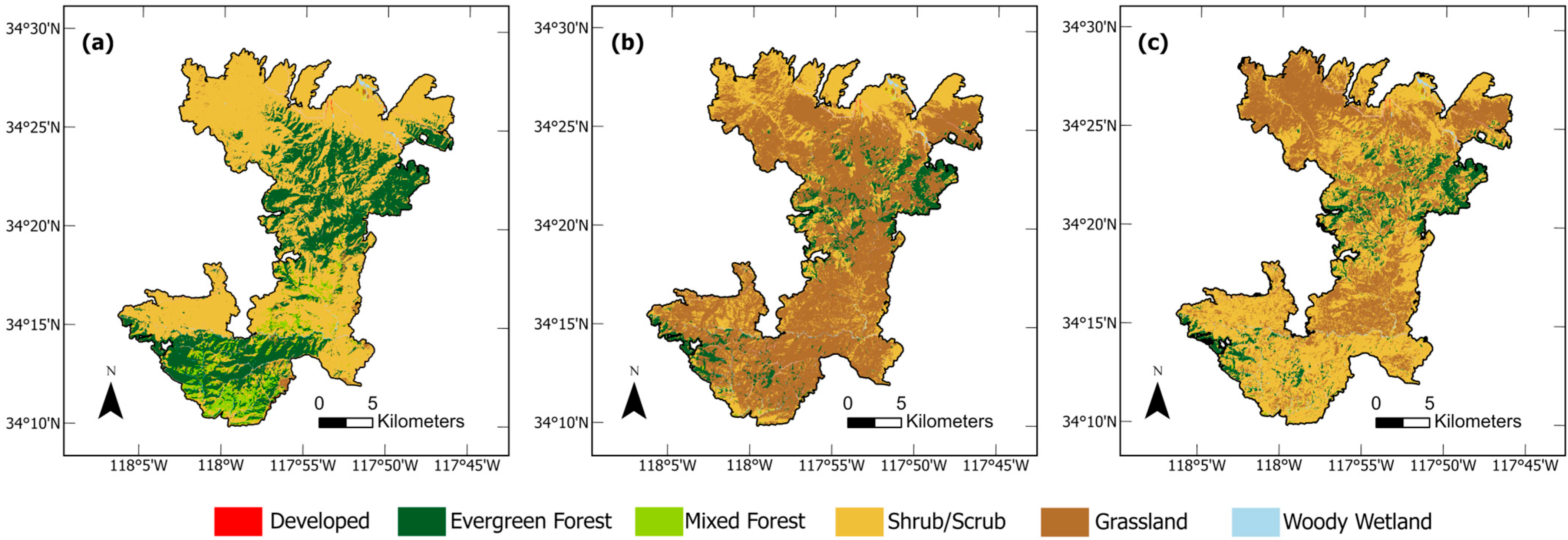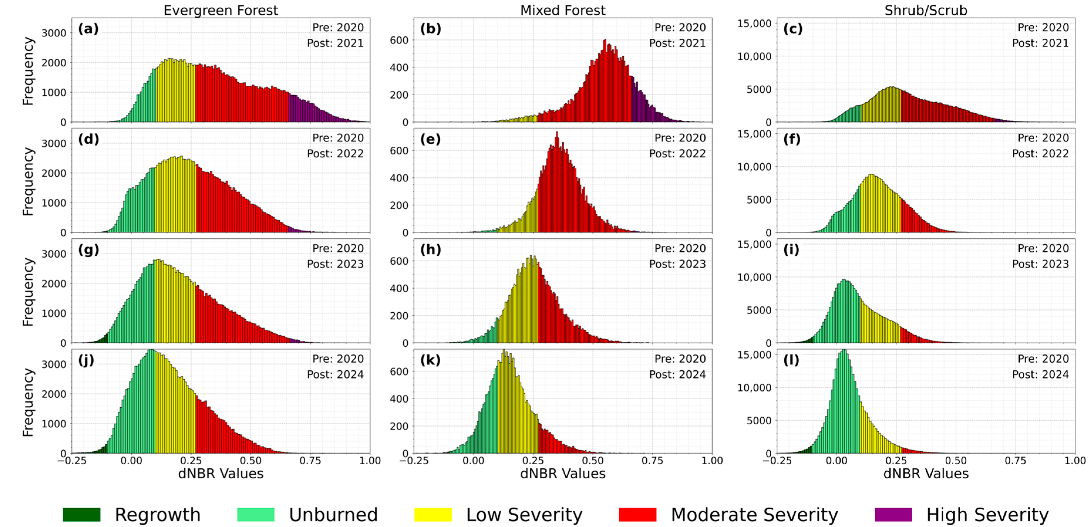 - Grassland in formerly forested areas indicates a potential ecosystem shift. Continued use of remote sensing for post-fire monitoring and targeted management is essential to support vegetation recovery and reduce vulnerability to future fires.