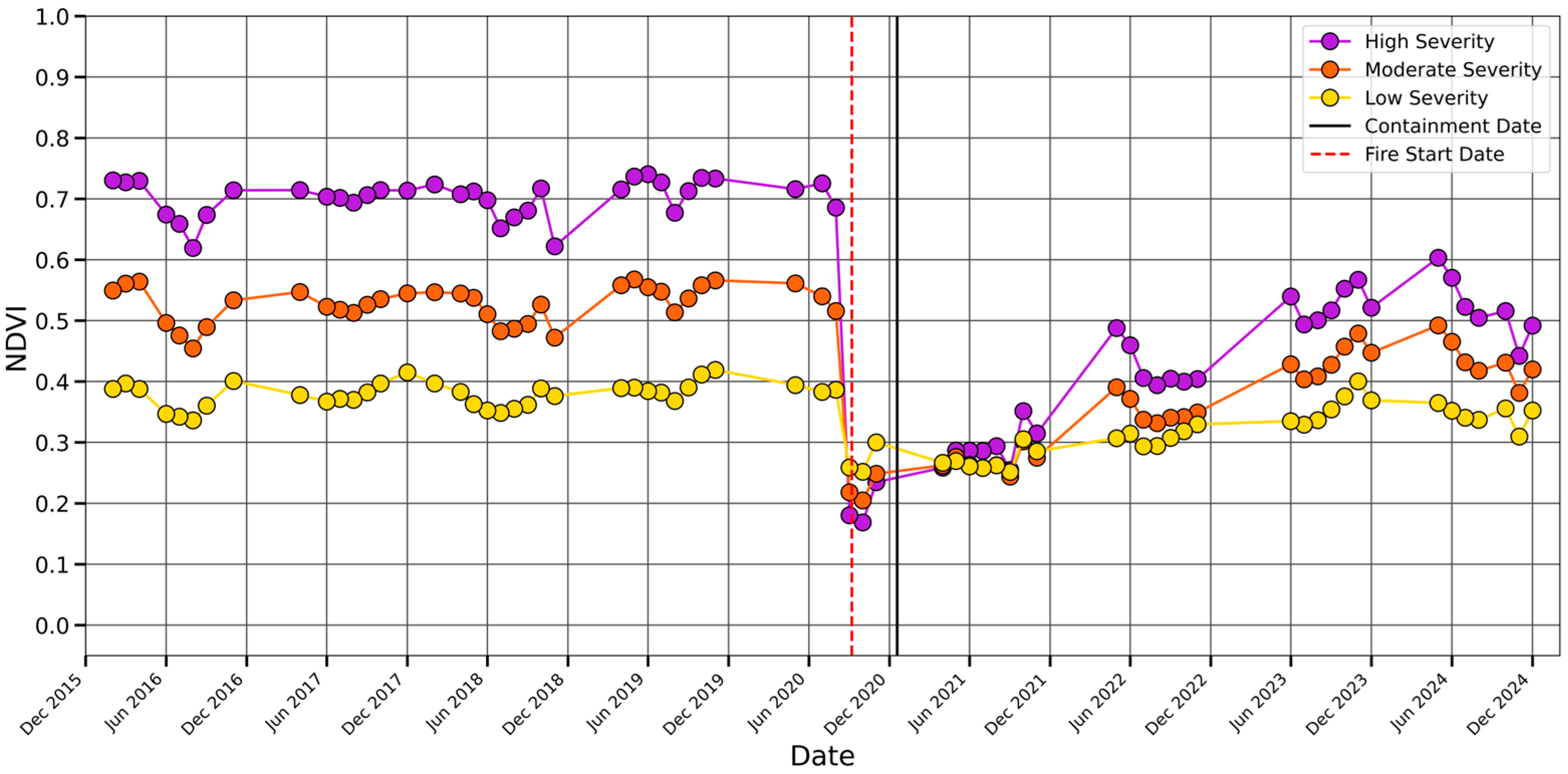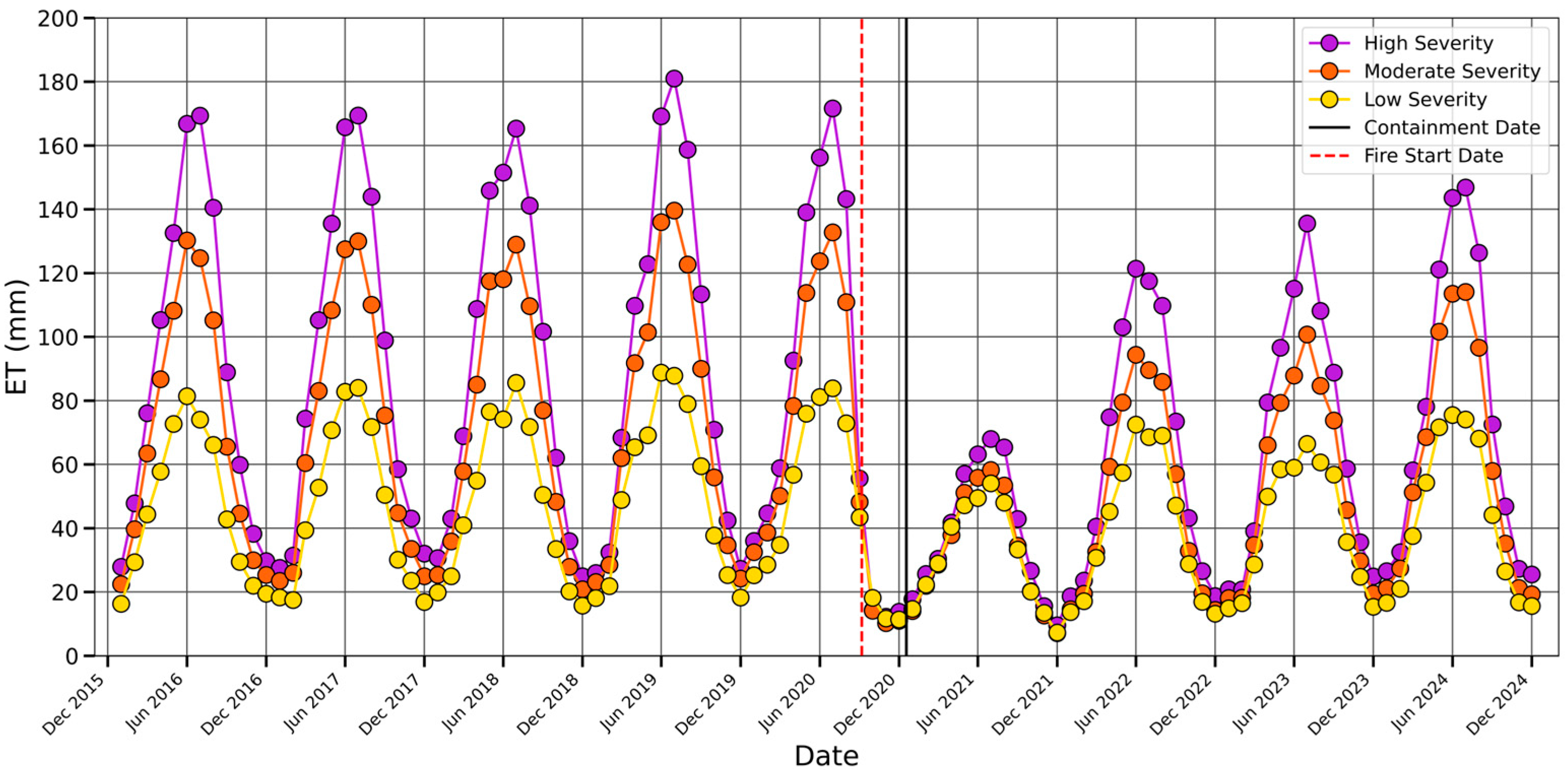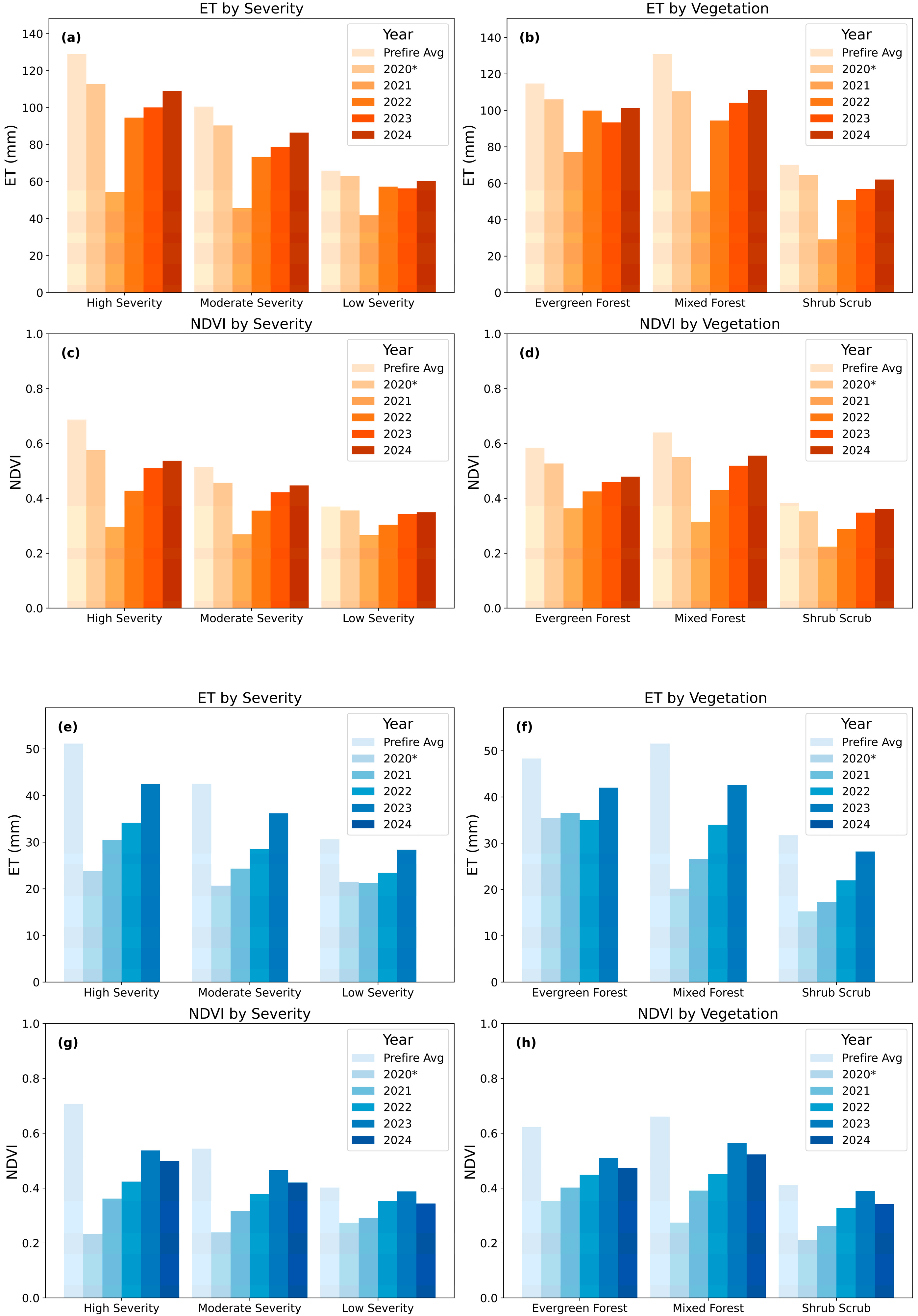 - ET and NDVI increased across all burn severity levels and dominant vegetation classes during both dry and wet seasons, with high-severity burned areas showing the most rapid post-fire recovery.