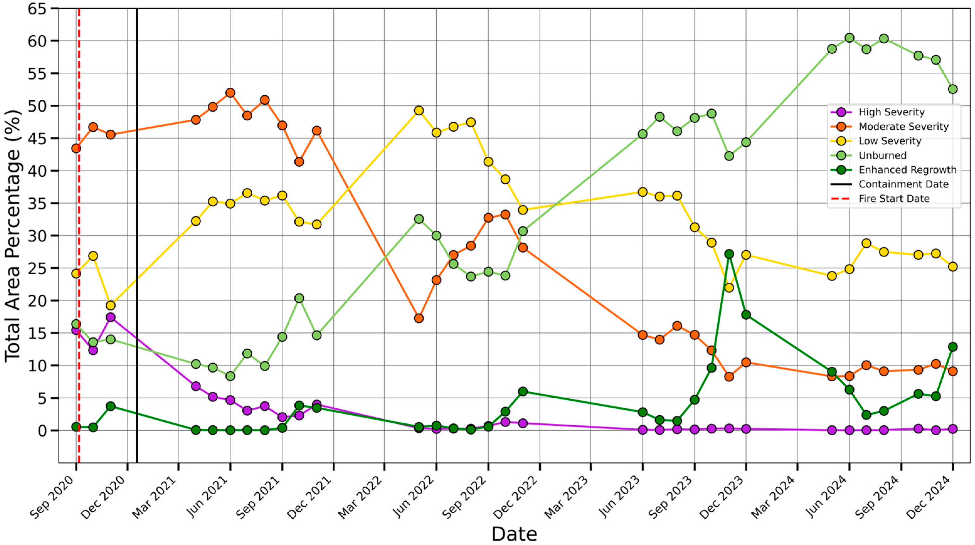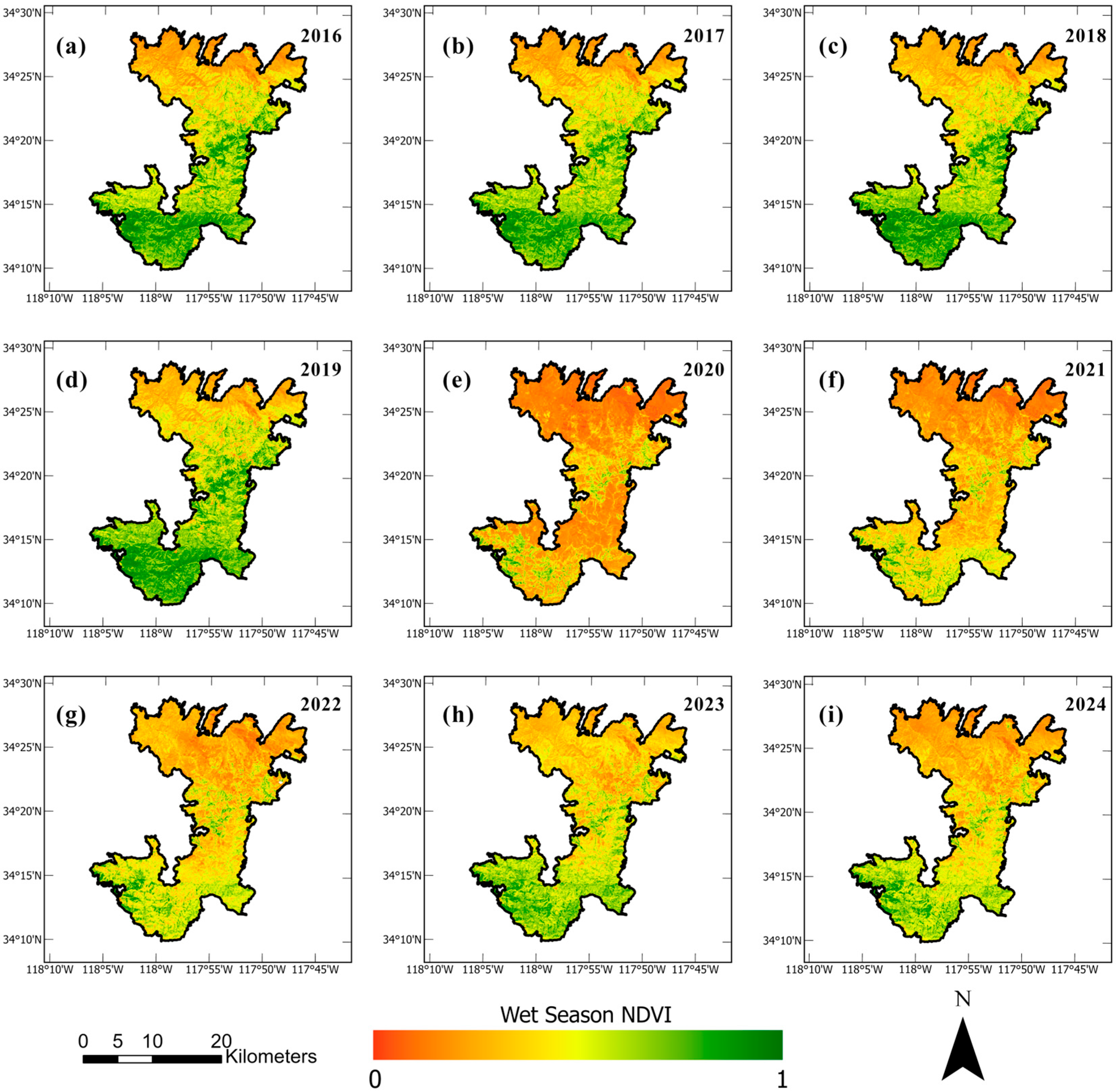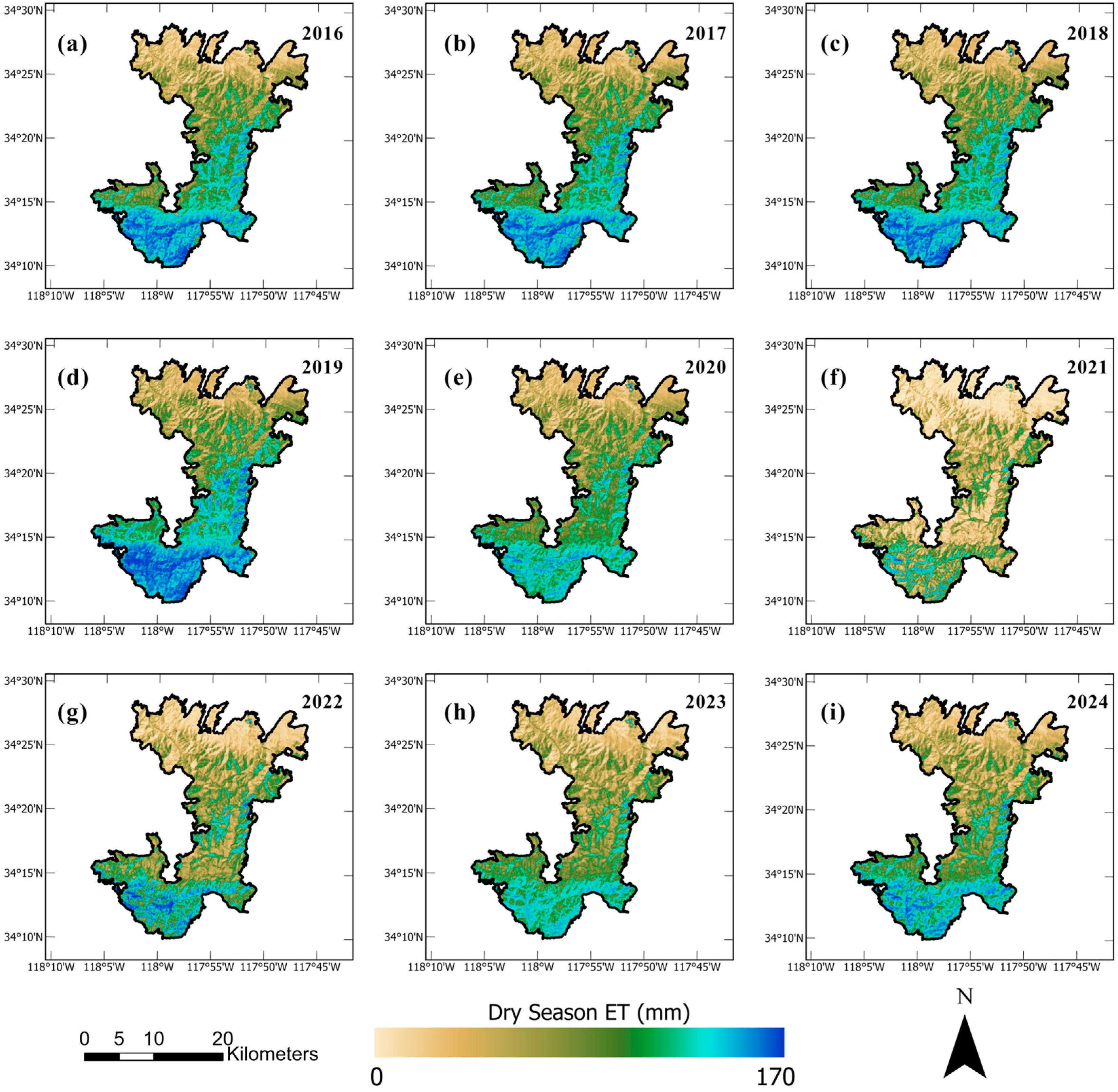 - ET and NDVI increased across all burn severity levels and dominant vegetation classes during both dry and wet seasons, with high-severity burned areas showing the most rapid post-fire recovery.