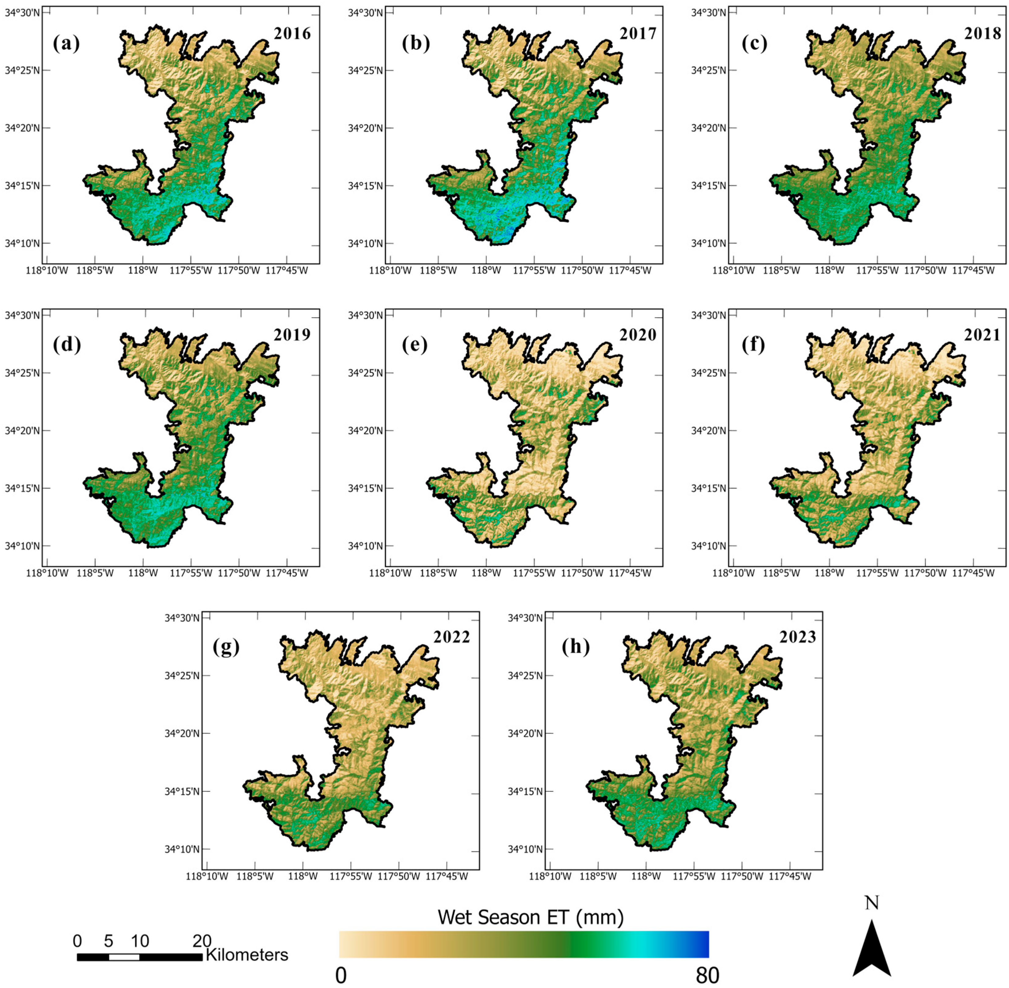 - Volk, J.M.; Huntington, J.L.; Melton, F.S.; Allen, R.; Anderson, M.; Fisher, J.B.; Kilic, A.; Ruhoff, A.; Senay, G.B.; Minor, B.; et al. Assessing the Accuracy of OpenET Satellite-Based Evapotranspiration Data to Support Water Resource and Land Management Applications. Nat. Water 2024, 2, 193–205. [Google Scholar] [CrossRef]