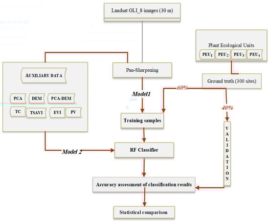 Figure 2 illustrates the methodology applied in this study to evaluate the results of different auxiliary datasets on PEUs’ mapping accuracy. First, the 30 m bands (two to seven) were pan-sharpened using the 15 m panchromatic band (band 8) of the OLI-8 sensor. Then, the complementary auxiliary layers of MSAVI, EVI, PV, PCAs, TCT derived from reflectance bands, and DEM were used to develop collection datasets to enhance the PEU mapping accuracy. The samples collected were divided into training points (60%) for classification and test points (40%) for accuracy assessment. Following that, the resulting map from the classification of reflectance bands, as well as reflectance bands that complemented with each auxiliary data, were validated using test points. Finally, a statistical analysis was conducted to evaluate the contribution of each auxiliary data source to the classification beyond the reflectance bands.