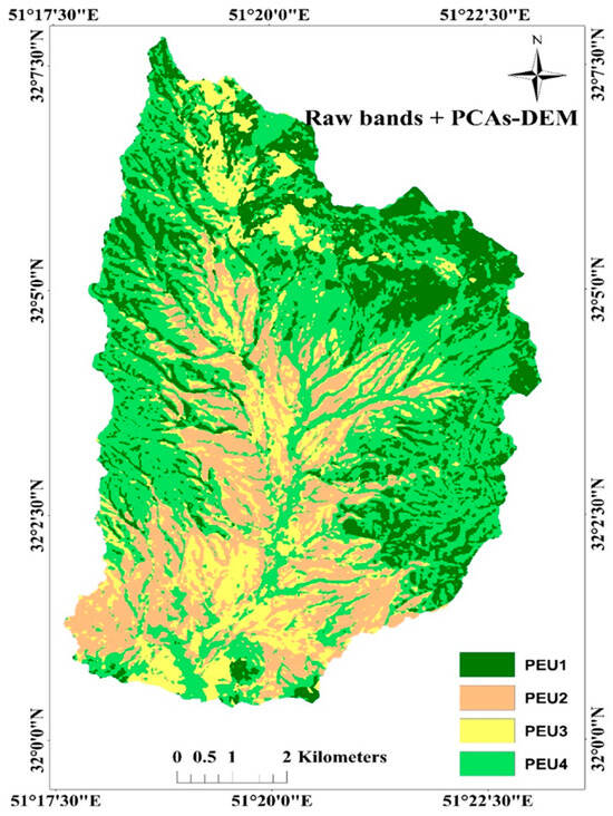 Table 3 presents the confusion-matrix results used to evaluate PEU classification accuracy, obtained by comparing the test points with the classification maps derived from the reflectance bands and auxiliary data. The table reports UA, PA, and KIA for each PEU, as well as the overall accuracy (OA) and overall kappa (OK) for each classification. The results show that since pan-sharpened reflectance bands were applied, PEU1 had the highest PA (78%), UA (88%), and KIA (71%). However, PEU3 had the lowest PA (56%), UA (56%), and KIA (40%). The OK was 52 and the OA 65%. Adding the auxiliary data to the reflectance bands led to an enhancement in classification accuracy. The auxiliary data effect showed that PCAs-DEM returned the highest OK (71%) and OA (79%). PEU1 had the highest PA (87%), UA (90%), and KIA (82%), and PEU4 had the lowest PA (69%), UA (74%), and KIA (58%), while PCA-DEM auxiliary data together with reflectance bands were used for classification. PEU1 had the highest PA, UA, and KIA in almost all auxiliary data, but in contrast, PEU4 had the lowest PA, UA, and KIA.