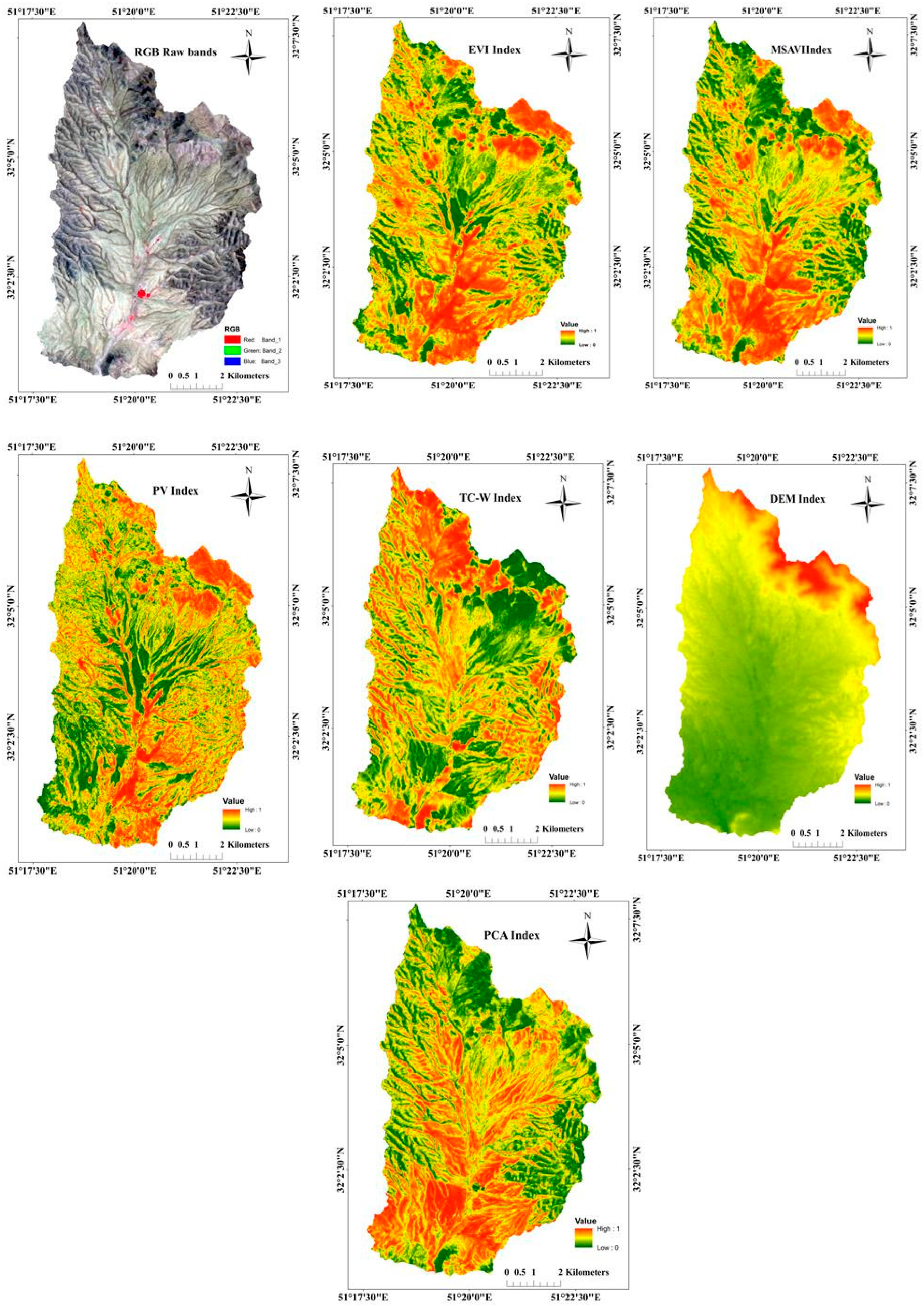 - Vegetation indices of the Modified Soil-Adjusted Vegetation Index (MSAVI), as a representative of soil-adjusted vegetation indices.
