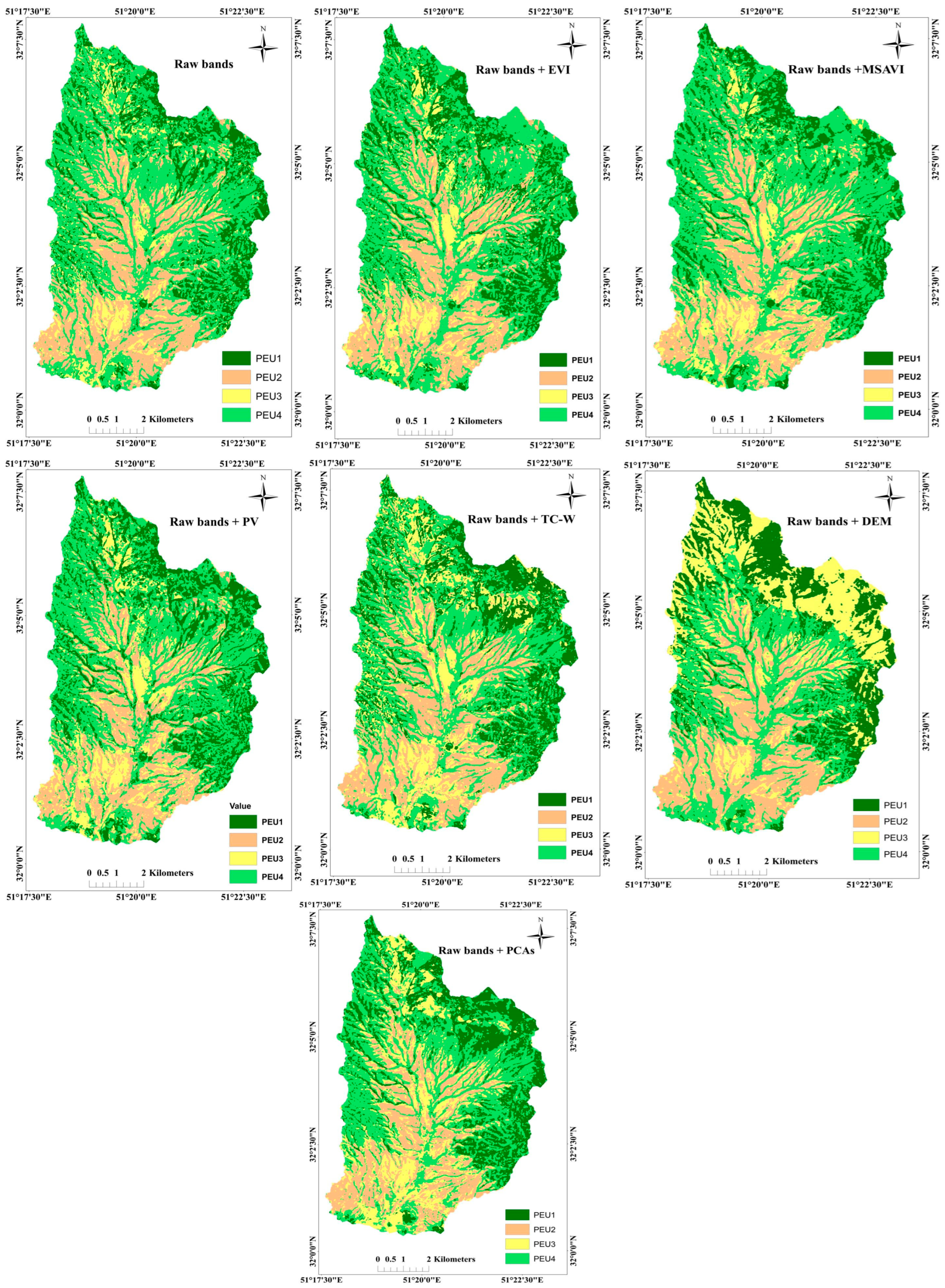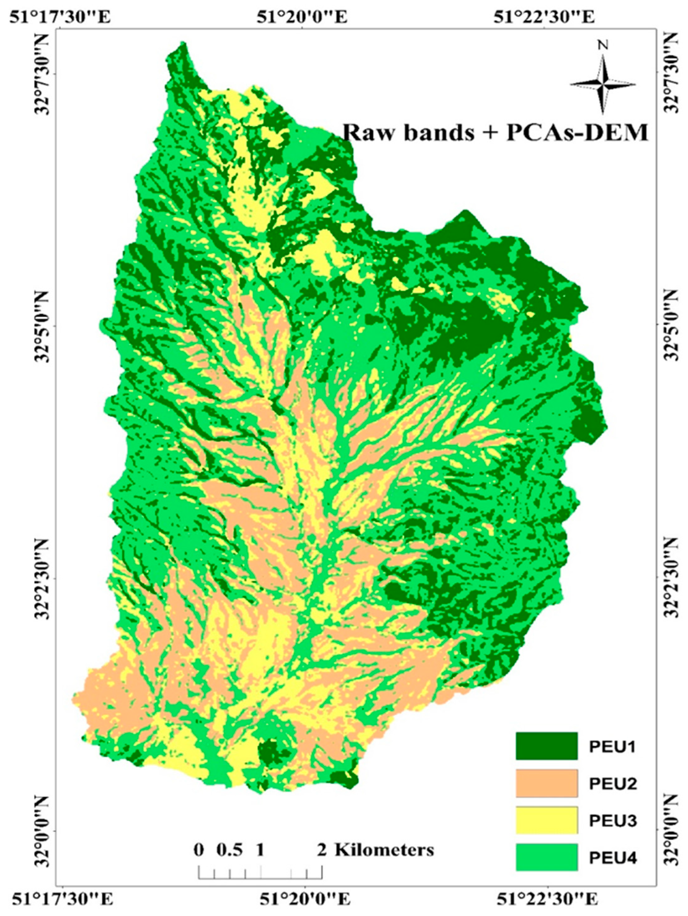 - Selecting auxiliaries can be costly and time-consuming. Our results indicate that DEM-derived terrain variables and PCA components should be prioritized with L8 + RF to improve PEU mapping accuracy, helping researchers concentrate efforts towards the area that yields the greatest gains and enabling more efficient, transferable workflows.