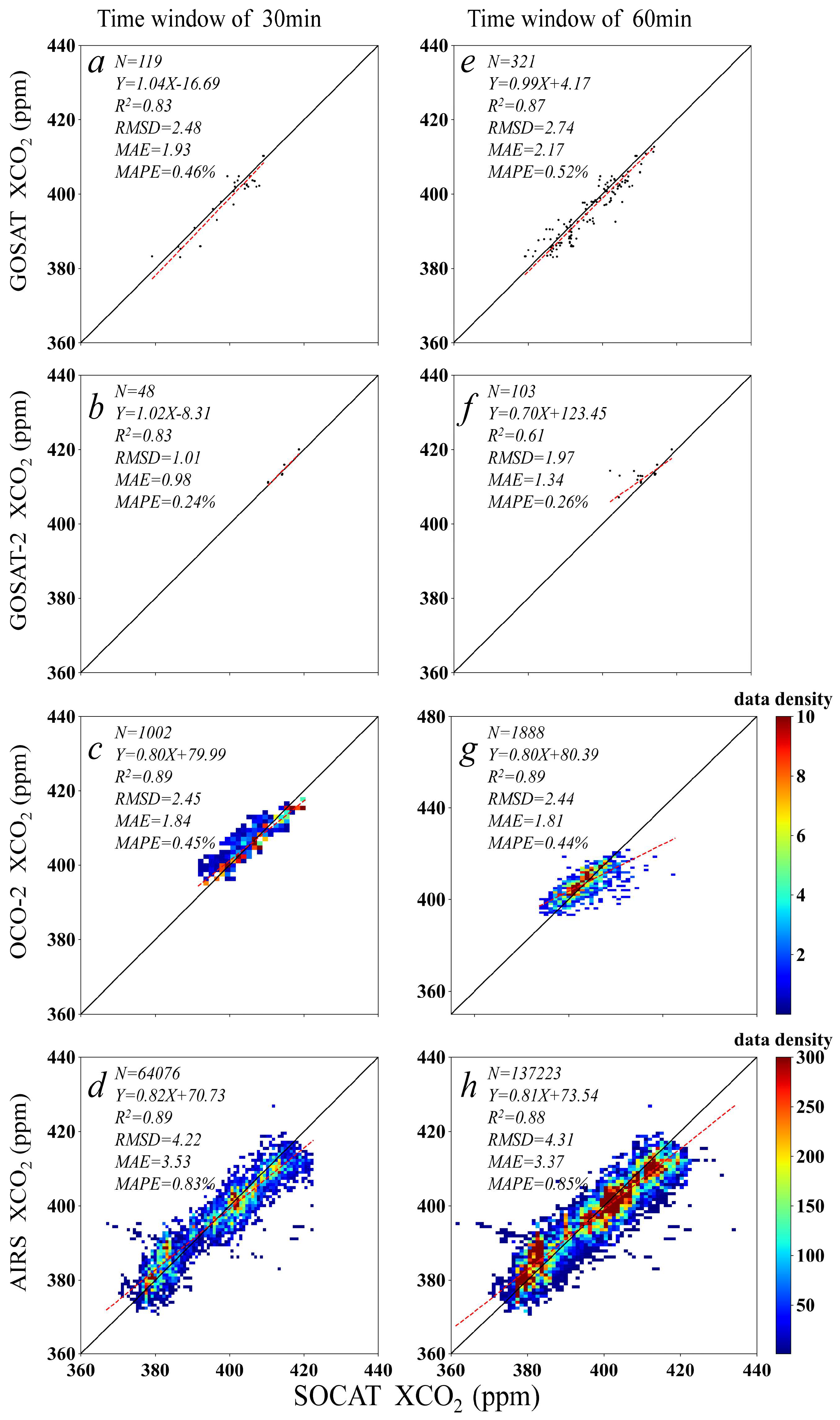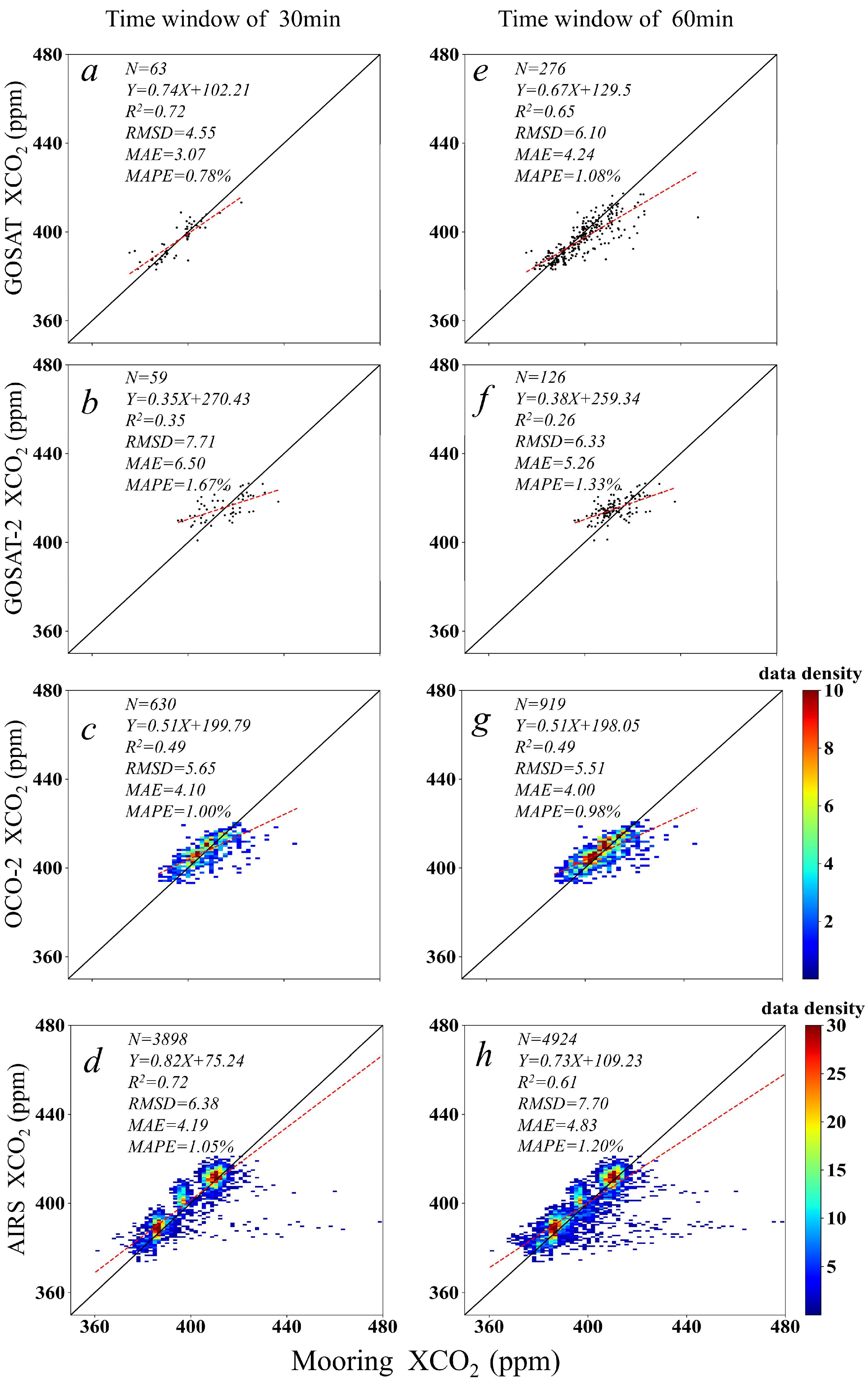 | Satellite/Sensor | Time Window (min) | N | R2 | RMSD (ppm) | MAE (ppm) | MAPE (%) |