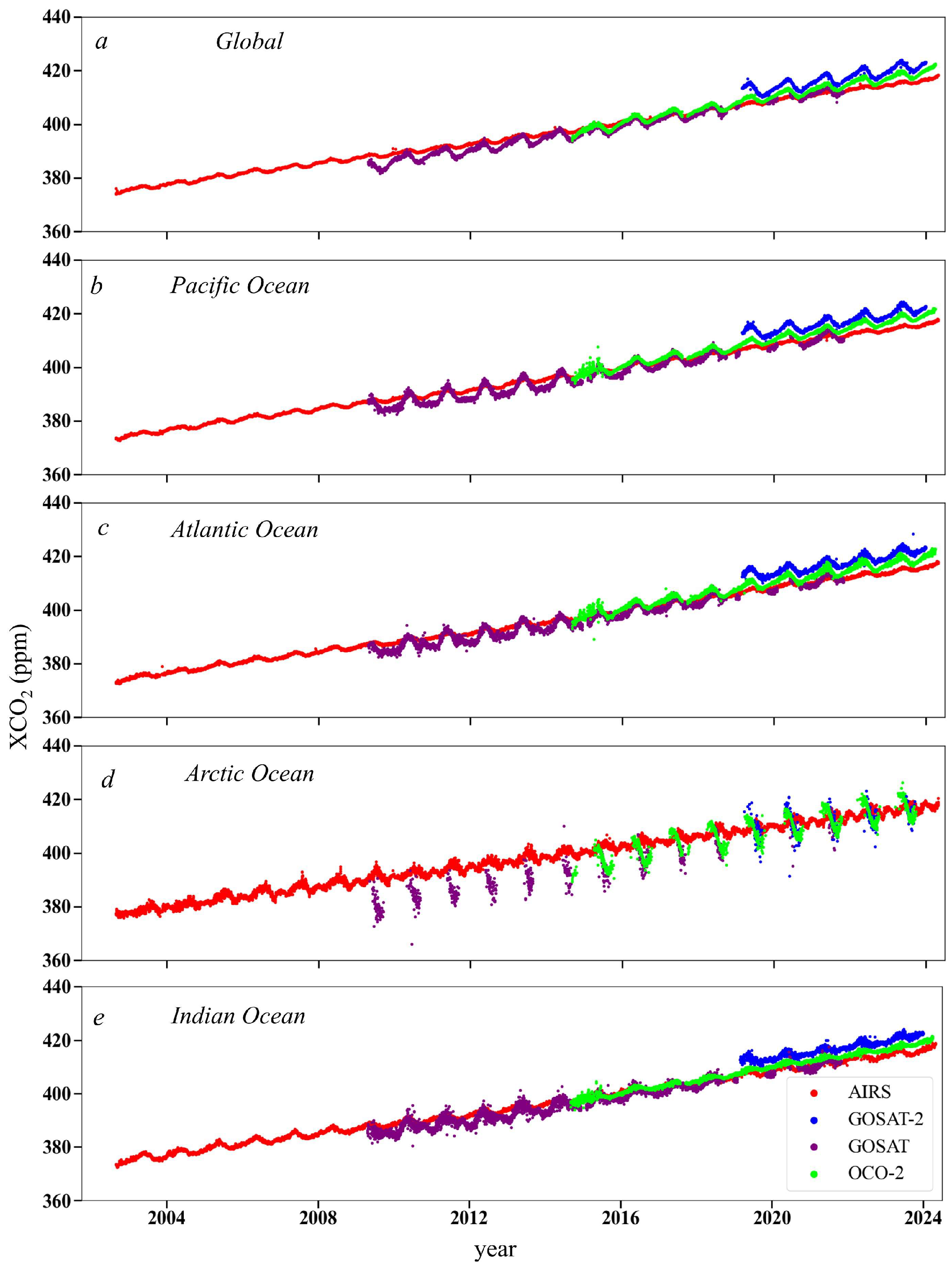 - Based on the longest data record from AIRS, the atmospheric XCO2 has been increasing at a rate of 1.87–1.97 ppm year−1 over global oceans in the past two decades.