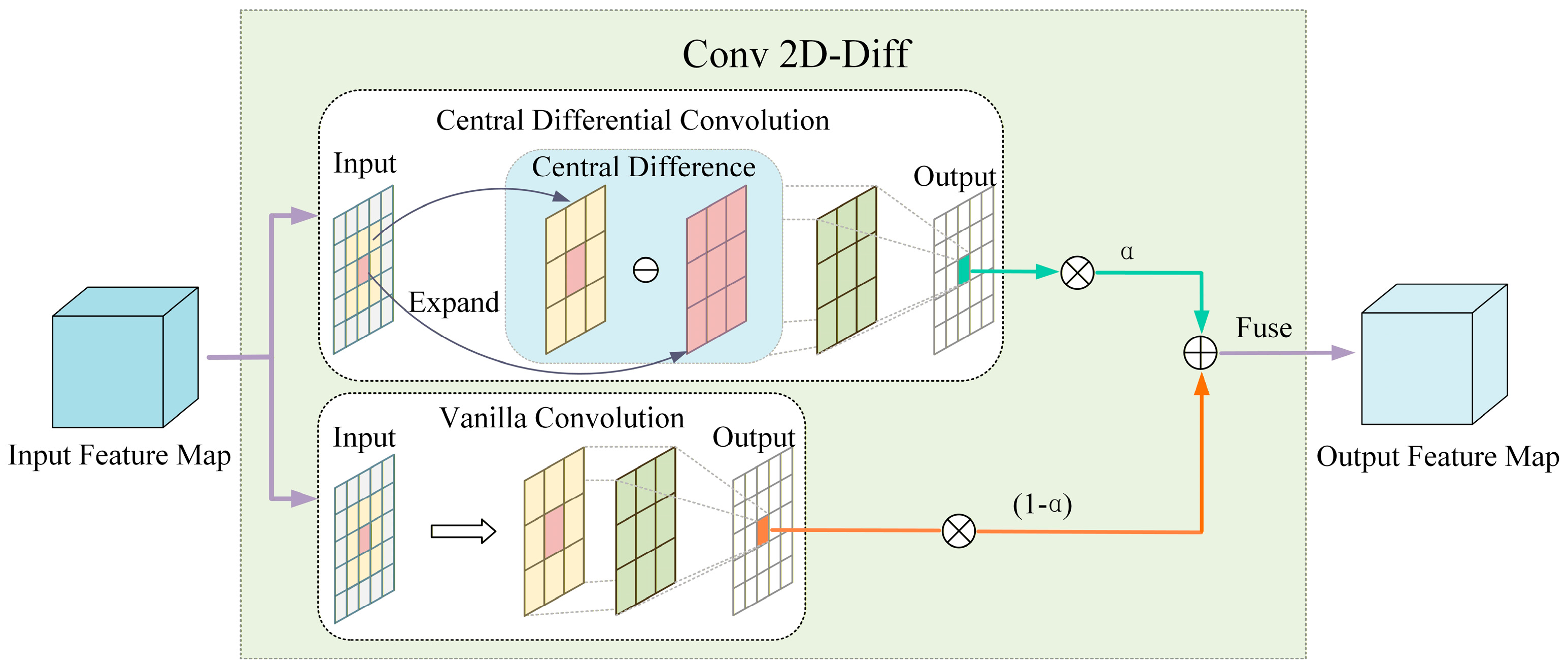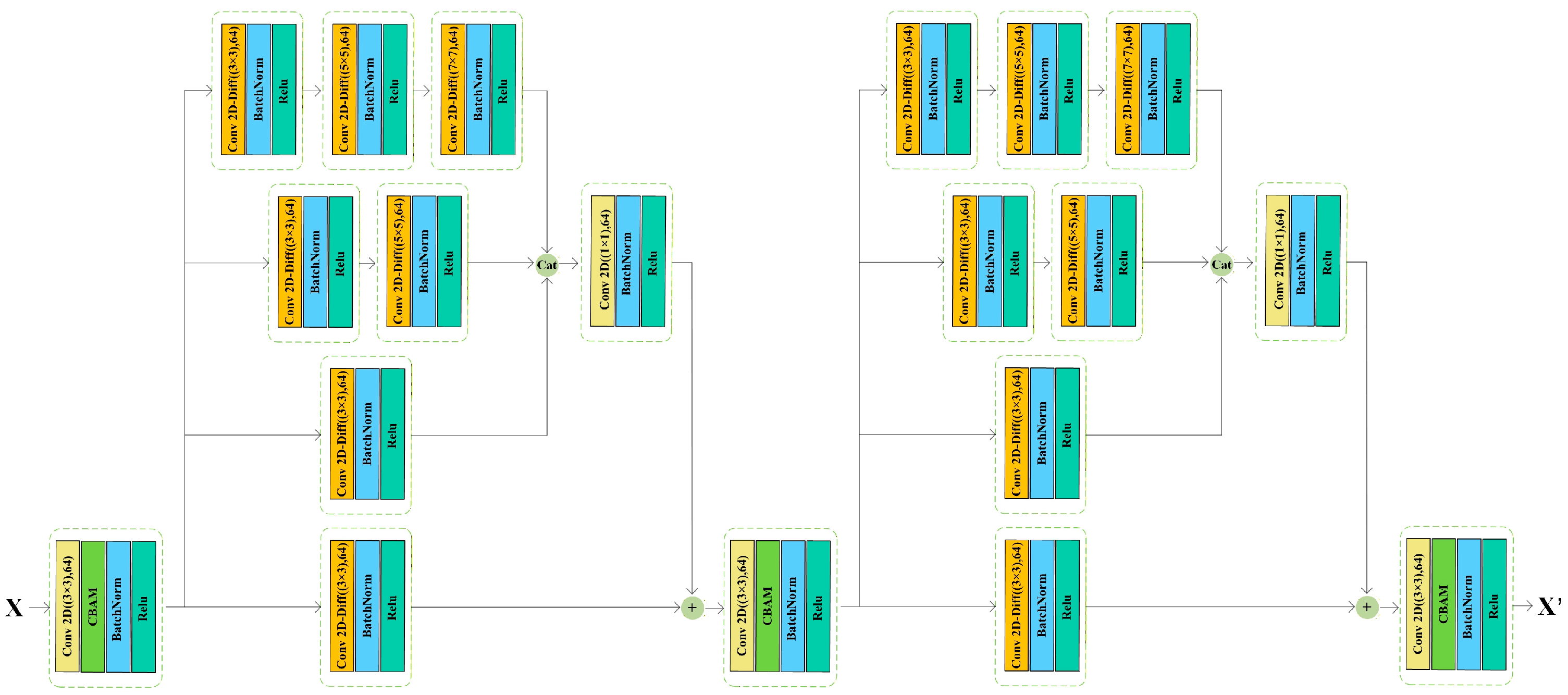 (2) An SSRE and an MDRM were designed. The SSRE module employs 3D convolutions with residual connections to enhance spectral–spatial feature extraction, while the MDRM block combines 2D differential convolutions with CBAM attention mechanisms to improve spatial feature discrimination. These integrated modules function cooperatively to strengthen the model’s discriminative power for land-cover categories with analogous spectral characteristics.