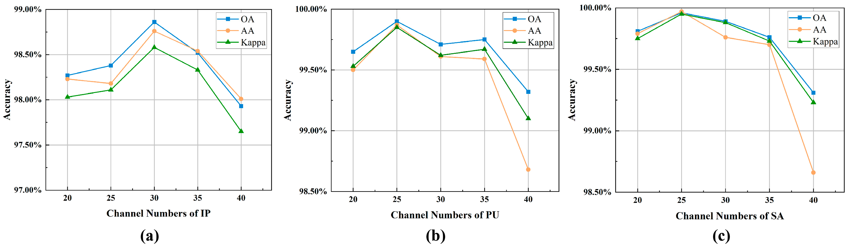 The analysis of hyperparameters provides additional insights. Both PCA channel numbers and spatial window sizes exhibit dataset-dependent optimal values. Excessive spectral dimensions introduce redundant information, whereas overly small dimensions weaken class separability. Similarly, spatial windows must balance contextual completeness and noise suppression. These findings indicate that STM-Net benefits from a tailored configuration that corresponds to scene characteristics.