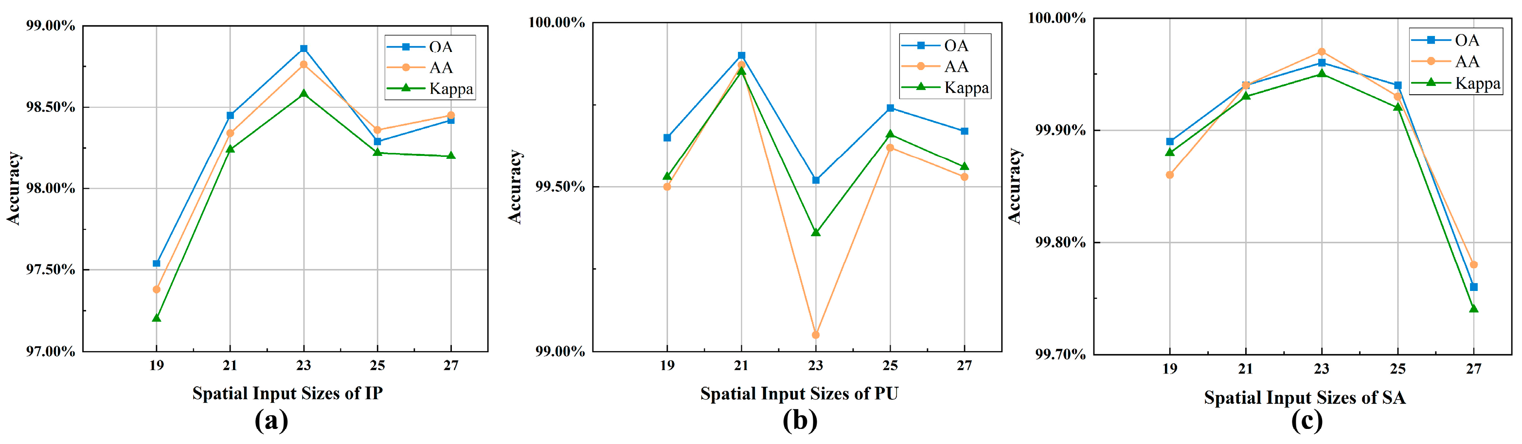 (1) Insufficient spectral–spatial feature fusion: Some methods lack effective fusion strategies when integrating local and global features, resulting in inadequate complementarity between spectral and spatial information.