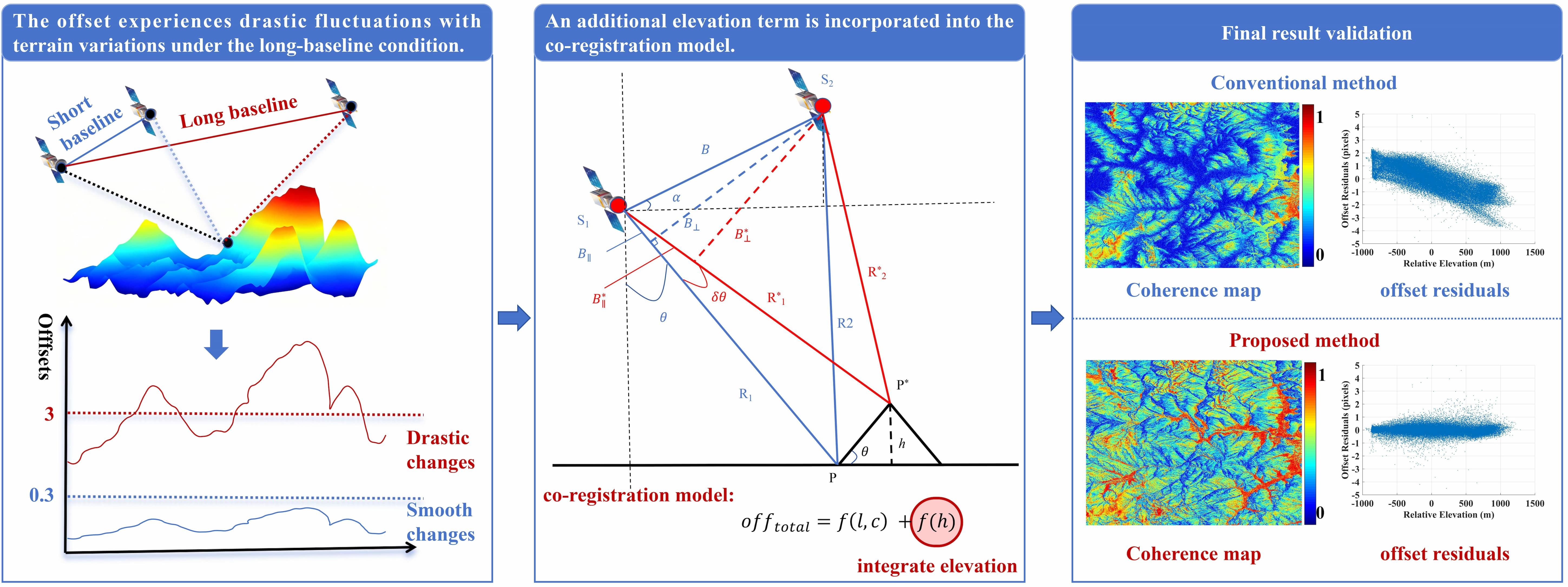- An enhanced fine co-registration method for long-baseline InSAR is proposed, integrating an elevation-dependent term to compensate for terrain-induced local offsets.
