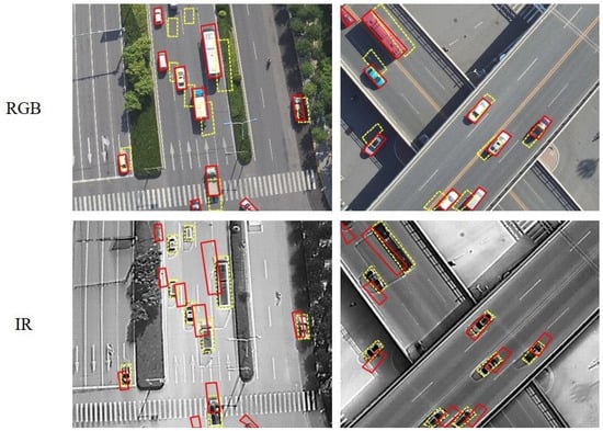 Recently, visible–infrared (RGB-IR) object detection on UAVs has attracted significant attention due to its ability to fully leverage complementary information and achieve robust all-day detection [3,4,5]. However, the visible and infrared images collected by different sensors are often not aligned correctly, resulting in misalignment of the interesting targets in the same observation scenario, as shown in Figure 1. This poses challenges to effective feature fusion in traditional cross-modal methods. Although extensive research has focused on achieving image preregistration, precise image alignment for UAVs remains challenging in practice. This challenge arises from the factors such as different imaging times of each sensor, diverse fields of viewing, and complex target motion [6].