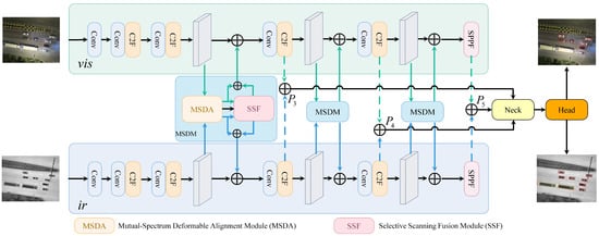 - A Mutual-Spectrum Deformable Alignment (MSDA) module is introduced to achieve precise spatial alignment of cross-modal objects, and a Selective Scan Fusion (SSF) module is designed to enhance the fusion capability of dual-modal features. Experimental results on two cross-modal benchmark datasets, DroneVehicle and DVTOD, demonstrate that our method achieves an mAP of 82.5% and 86.4%, respectively, significantly outperforming other fusion detection methods.