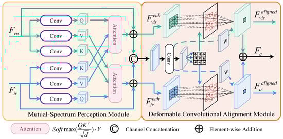 The core challenge of cross-modal feature alignment lies in establishing precise semantic correspondences between the two modalities. Traditional approaches often directly process raw features, overlooking the inherent information asymmetry and complementarity between modalities. To address this problem, we design a mutual spectral perception (MSP) module to achieve interaction and collaborative enhancement through a bidirectional cross-attention mechanism. Here, “spectral” refers to the characteristic feature spaces of each modality. “Mutual spectral perception” means that, through a bidirectional attention mechanism, the model can actively explore and fuse complementary information within this multi-scale feature space to achieve feature enhancement. However, only enhanced features are insufficient for precise spatial alignment. Therefore, we further utilize the enhanced features as a reference modality through deformable convolutions [28] to achieve end-to-end feature calibration. Combining the explicit geometric transformation capability of deformable convolutions with the feature enhancement capability of MSP mechanism, the MSDA module learns its spatial transformation parameters with high semantic consistency. The whole design is illustrated by Figure 3.