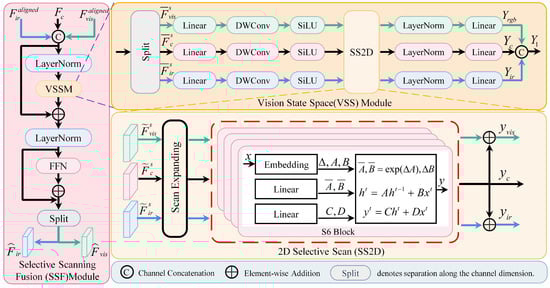 where Linear(·) represents projection operations using linear transformations, DWConv(·) are deep convolution operations, and SiLU(·) means the SiLU activation function. The results and , respectively, represent the visible modality, infrared modality, and fusion modality inputs for the latter SS2D module. All input modalities are fed into a shared SS2D module, yielding outputs , and .