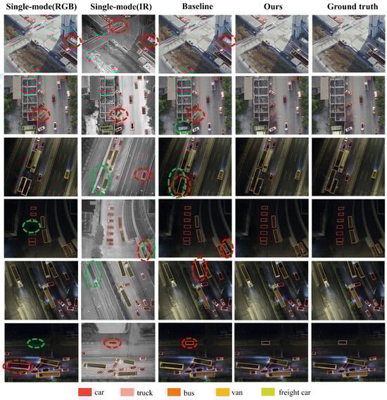 Visualization of detection results on the DroneVehicle dataset. Red dashed circles indicate false positives, while green dashed circles denote false negatives. Single-mode (RGB) and single-mode (IR) represent YOLOv8’s detection results on visible and infrared images, respectively. Baseline represents YOLOv8’s detection results using bimodal images. Ground truth shows the true labels, here using infrared labels.