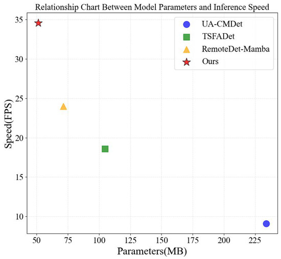Figure 6 shows a comparison of our method with several others in terms of computational parameters and speed. The testing is conducted on the DroneVehicle dataset. For a fair comparison, the test images size for all detection models are set to 640 × 640. Our proposed MSDF-Mamba achieves the best detection performance among all compared methods while operating at 34.6 FPS with a model size of only 51.34 MB. Notably, it reduces the number of parameters by approximately 40% compared to the DMM baseline (87.97 MB).This achieves a balance between effectiveness and computational complexity.
