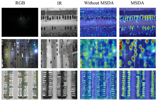 We first analyzed the impact of MSDA module, which employs a bidirectional cross-attention mechanism to achieve deep interaction between two modalities. As shown in Table 5, the baseline mothod achieves an mAP@0.5 of 78.9% while the baseline + MSDA method increases the mAP@0.5 by 1.9% to 80.8%. To visualize how the MSDA module enables more precise feature region localization, we utilized Grad-CAM [49] to generate heatmaps of intermediate features with and without the MSDA module, as shown in Figure 7. To clearly present the results, we overlay the heatmap onto the original image. The results clearly show that after adding the MSDA module, both the number and intensity of activation regions increase significantly, especially in the central area of target. By contrast, feature responses in non-target regions or misaligned areas are significantly suppressed. These experiment results illustrate that the baseline + MSDA method focuses its attention more intently on the target region, leading to more accurate detection.