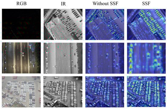 We then validated the necessity of the SSF module within the fusion network architecture. It is well known that mismatching in visible and infrared images ruins good modeling of cross-modal features. When adding SSF module, the baseline + SSF method yields a significant improvement of +2.2% mAP@0.5, demonstrating the effectiveness of SSF model. To further investigate its effectiveness, a comparison of intermediate feature heatmaps is shown in Figure 8. With the SSF module, it is clear that the heatmaps show a higher degree of focus on target objects while effectively suppressing background noise.