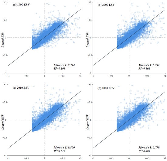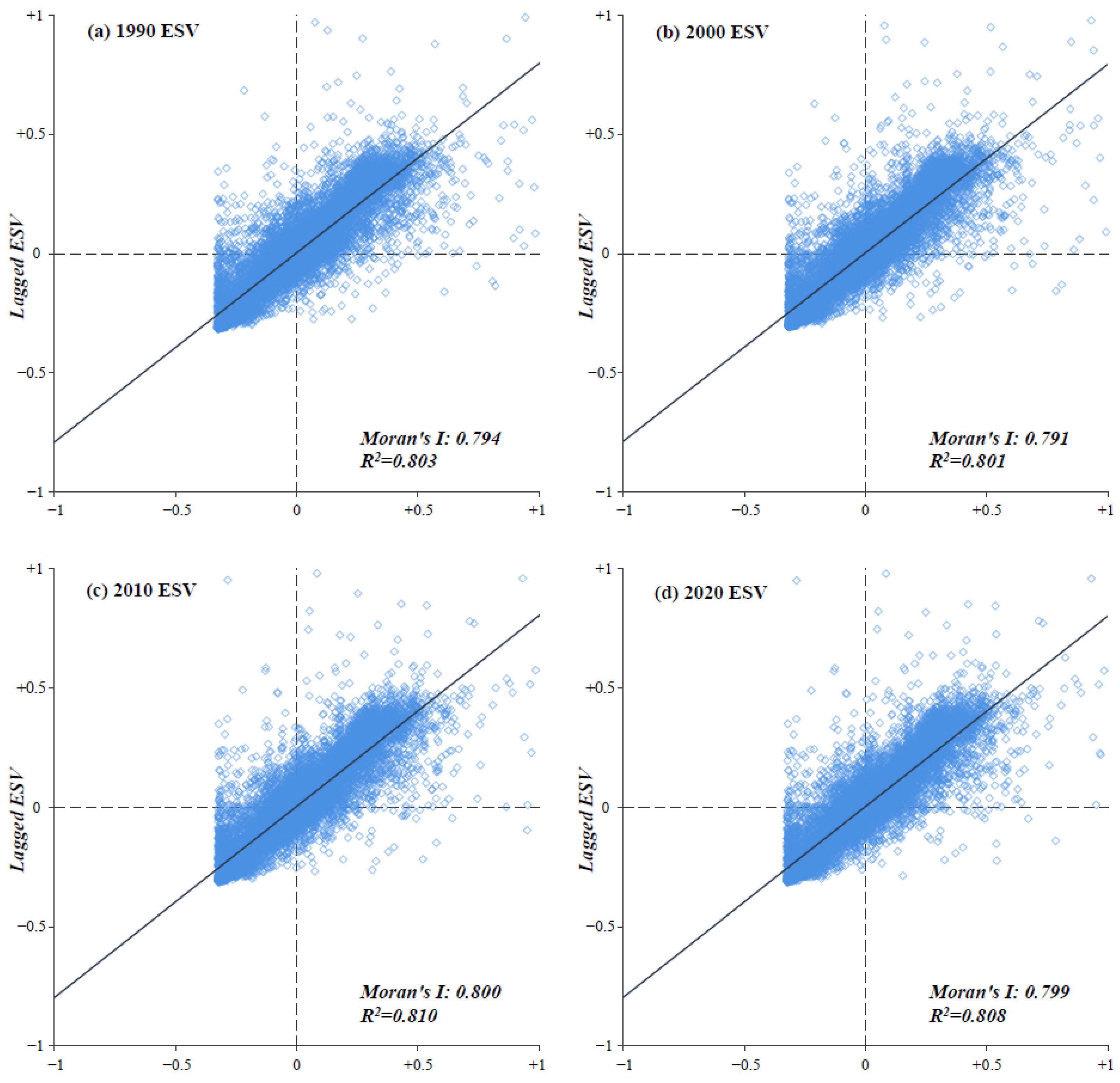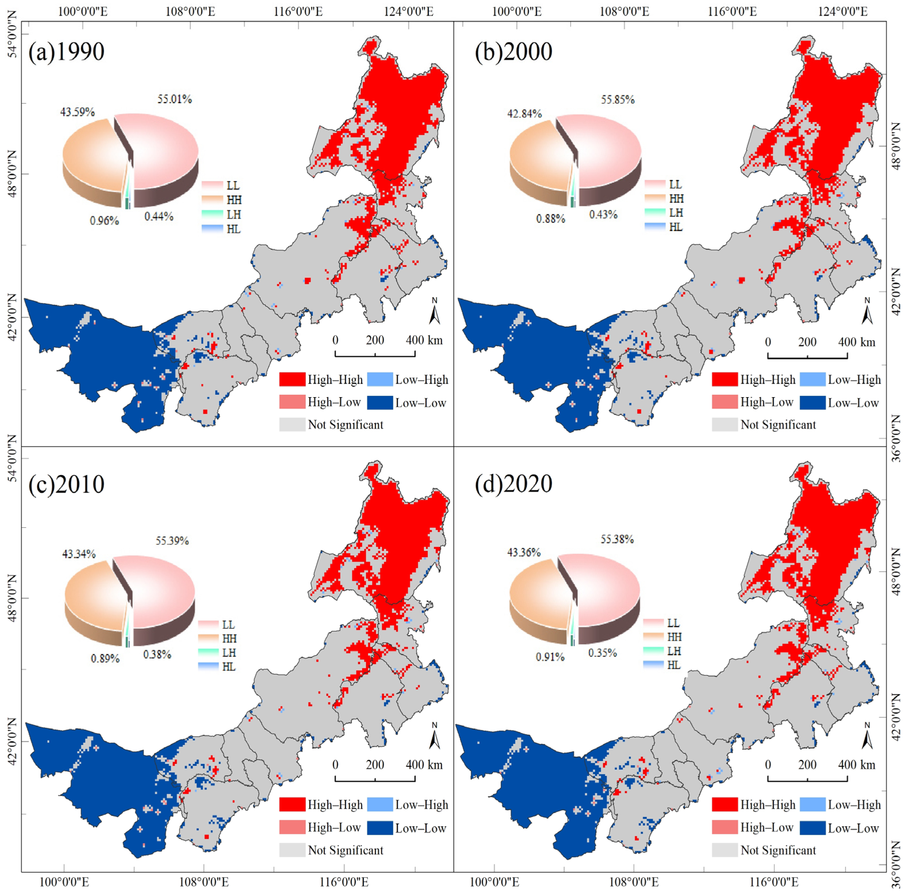 - The ESV displayed obviously spatial agglomeration effects. The high–high clusters were primarily concentrated in eastern Inner Mongolia, but the low–low clusters were predominantly distributed across the western region and centered around Alxa League.