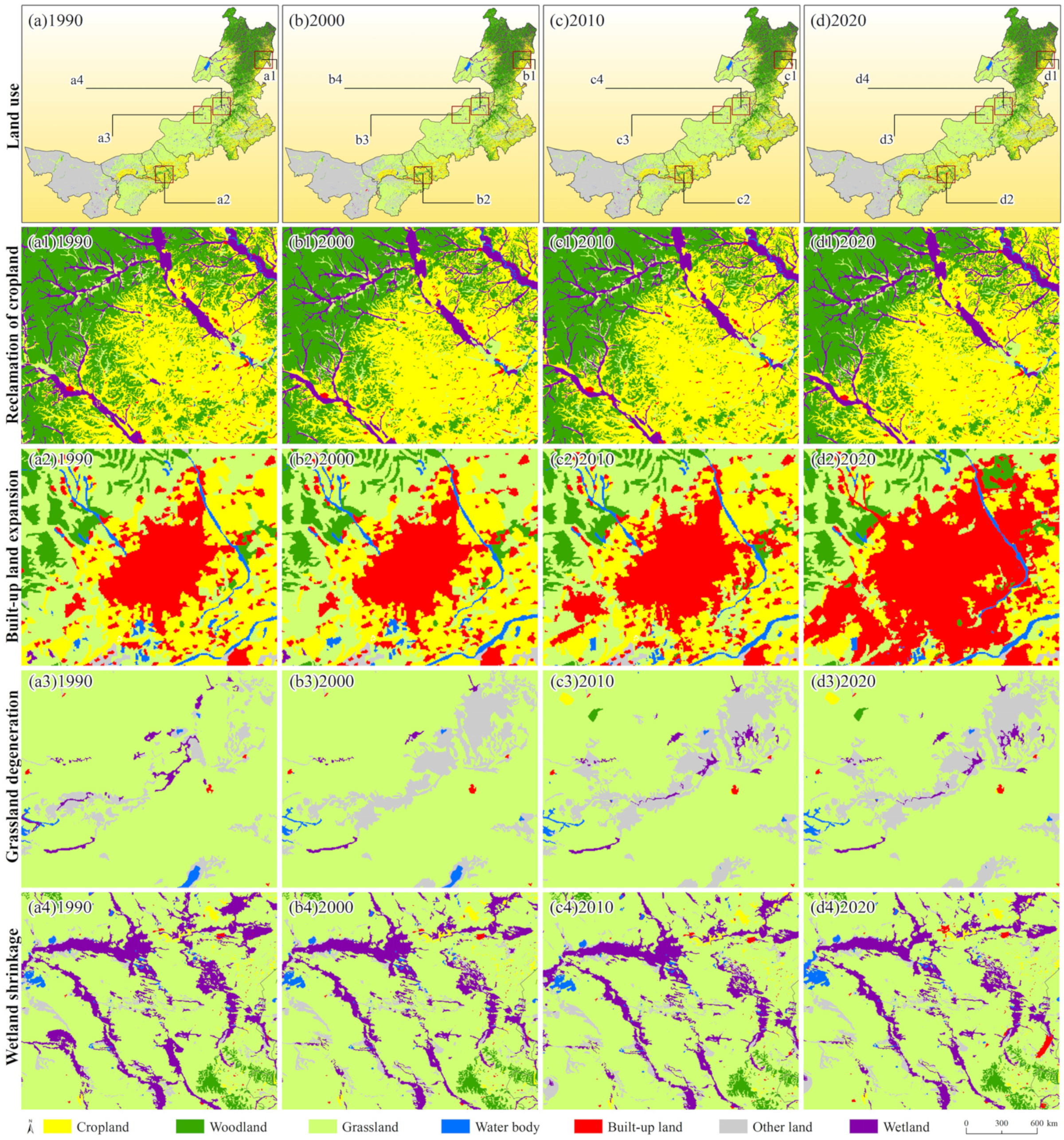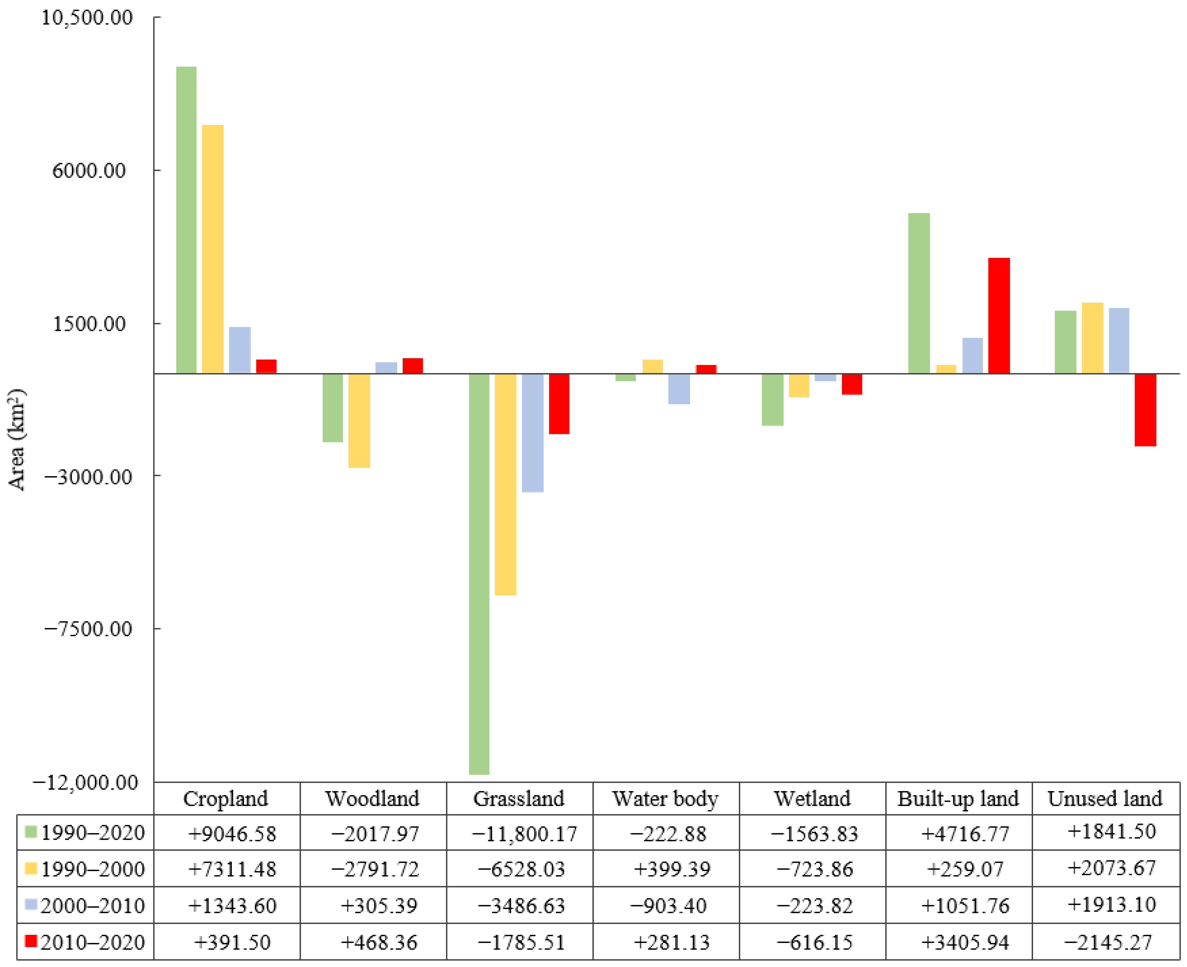 - Remote sensing revealed cropland and built-up areas expanded persistently, while grassland and wetland declined. Spatially, forest, grassland, and unused land dominated sequentially along the east–west gradient.