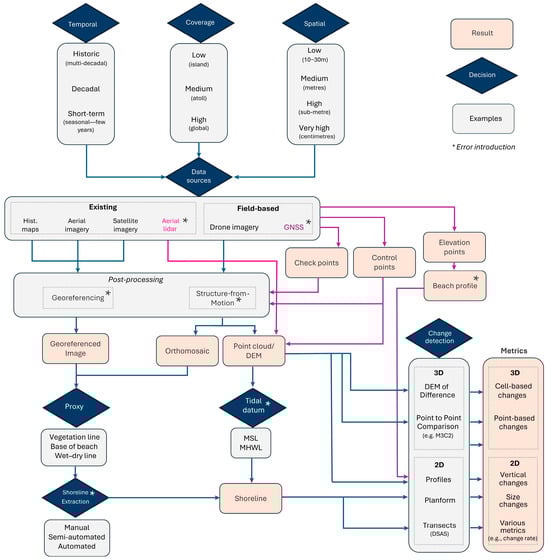 The findings are organised sequentially with regard to the steps and decisions needed to conduct a shoreline change analysis: the general steps are to first map the shoreline at specific points in time, which includes acquiring data and defining the shoreline and extraction method, and then to compare the various shorelines over time. A summary of the methodological workflow, explained in detail in the following sections, is illustrated in Figure 1. To enhance readability across multiple subtopics, the Introduction, Results, and Discussion are integrated for each step, rather than following the traditional structure of presenting all topics in detail within the Introduction, followed by a separate Section 3.