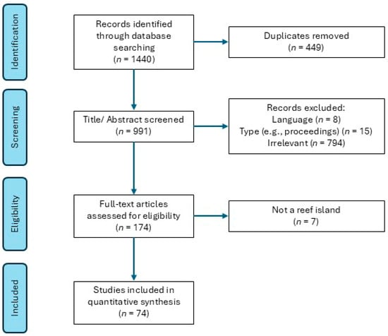 Recognising the uniqueness and importance of studying shoreline changes in reef islands, the aim of this paper is to review past and current methods used to measure these changes to determine the trends in methods, potential research gaps, and future directions in studying these highly vulnerable reef islands. This review focuses on data sources and methods used to assess short-term (daily or seasonal) to decadal changes in reef island shorelines and beaches. It also provides the bibliographic metrics and geographic distribution of the studies included here. However, studies focusing on drivers of change (e.g., [21,22]), hydrodynamic modelling (e.g., [23]), or broader island evolution (e.g., [24]) are excluded unless they directly quantify shoreline change. The findings presented here may serve as a reference point for researchers investigating shoreline changes in reef islands, providing a foundational framework to guide future studies.