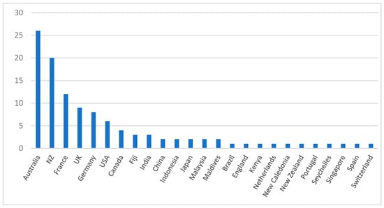 An analysis of author affiliations shows that most of the studies were led by researchers from Australia, New Zealand, and France, taking into account the affiliations of all contributing authors rather than just the first author (Figure 3). Although most reef islands are in Small Island Developing States (SIDSs), these regions remain underrepresented among authors. While China and Japan are not SIDSs, the number of studies originating from these countries may be underestimated due to the language-based exclusion criteria.