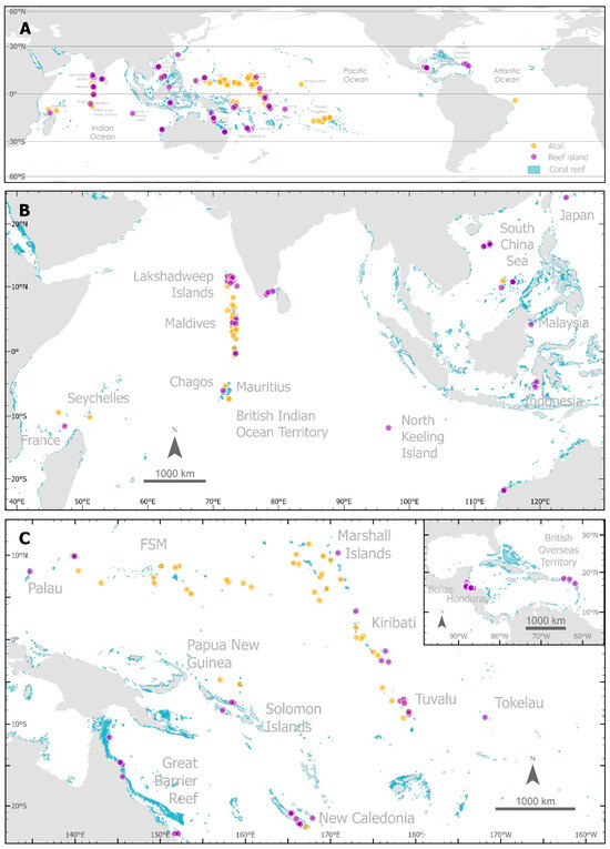 | Marshall Islands | Ailinglaplap Atoll 53, Ebon Atoll 43,54, Jabat Atoll 54, Jaluit Atoll 55, Lae Atoll 43,54, Likiep Atoll 43,54, Majuro Atoll 43,56, Mejit Atoll 43, Mejit Island 54, Nadikdik Atoll 43,57, Rongerik Atoll 43,54, Ujae Atoll 43,54, Wotho Atoll 43,54, Wotje Atoll 43,58 | - | 14 | 53 Ford et al. (2020) [103], 54 Ford & Kench (2015) [104], 43 Kench et al. (2024) [55], 55 Ford & Kench (2016) [105], 56 Ford (2012) [106], 57 Ford & Kench (2014) [107], 58 Ford (2013) [108] |
