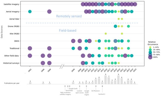 - Most studies rely on remote sensing, especially high-resolution satellite and aerial imagery; only 11% use field data exclusively.