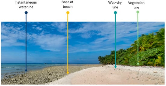 Reef islands are small, low-lying islands that sit atop coral reef platforms, like barrier reefs, fringing reefs, platform reefs, or atolls. They consist of material derived from the surrounding coral reef system, which is transported by hydrodynamic processes [1,2,3]. These islands occur in the mid- to low-latitudes and represent the most widespread island type in both the Pacific [4] and the Indian Oceans [5]. Many of them are classified as atoll islands, which are islands situated on an atoll rim or a patch reef inside an atoll lagoon. An atoll is a ring-shaped mid-ocean reef with a lagoon [6]. In regions like the Caribbean and Australia, reef islands are commonly referred to as cays. Most are only a few hectares to a few square kilometres in size and typically rise only a few metres above sea level, making them susceptible to environmental changes like sea level rise and changes in the storm and wave regime [7,8,9]. The associated risks facing these islands, such as coastal erosion, inundation, and saltwater intrusion, are a growing concern for many reef island populations, especially for nations like Tuvalu, the Marshall Islands, and Kiribati, which consist exclusively of atoll islands and other types of reef islands [10]. This fundamental issue has also drawn the interest of the research community [11] and is reflected in numerous publications addressing shoreline changes and reef island vulnerability (Table 1). Analysing and understanding historical shoreline changes in reef islands and the drivers of these changes can lead to better future projections and appropriate adaptation measures [10].