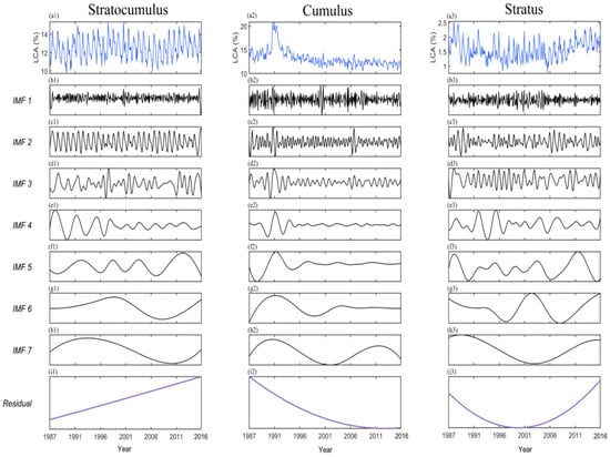 The EEMD map of the monthly average low cloud amount over ocean. The blue solid lines represent the original time series distributions of the three types of low cloud amount, and each black solid line represents the time series distributions of the decomposed components at different intrinsic mode functions (IMFs); the purple solid line is the residual trend term. (a1–i1) for stratocumulus, (a2–i2) for cumulus, (a3–i3) for stratus.