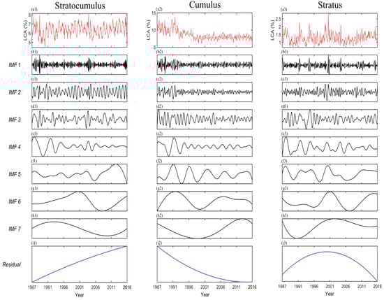 The EEMD map of the monthly average low cloud amount over land. The red solid lines represent the original time series distributions of the three types of low cloud amount, and each black solid line represents the time series distributions of the decomposed components at different intrinsic mode functions (IMFs); the purple solid line is the residual trend term. (a1–i1) for stratocumulus, (a2–i2) for cumulus, (a3–i3) for stratus.