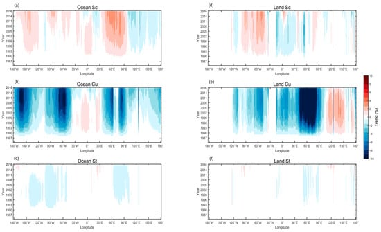 Longitude and time distribution of long-term cumulative nonlinear trend for different types of low cloud amount over ocean and land: (a) stratocumulus for ocean, (b) cumulus for ocean, (c) stratus for ocean, (d–f) same as (a–c) but for land.