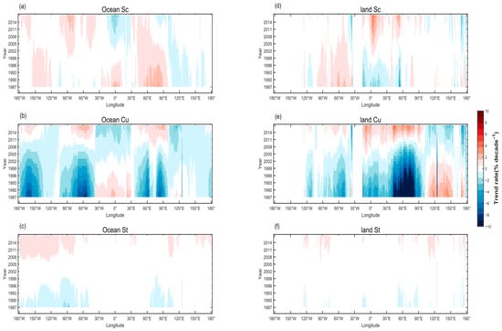 Longitude and time distribution of the evolution rate of trend for different types of low cloud amount over ocean and land: (a) stratocumulus for ocean, (b) cumulus for ocean, (c) stratus for ocean, (d–f) same as (a–c) but for land.