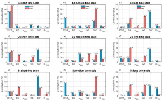 The decompositions of LCA have revealed substantial differences in variability among cloud types and between oceanic and continental regions across both temporal and spatial scales. Importantly, these timescale-dependent differences in cloud behavior primarily arise from variations in the dominant CCFs. Thus, identifying the key meteorological drivers and underlying physical mechanisms at different timescales is essential for improving our understanding of low cloud responses to climate change and long-term warming. Figure 8 summarizes the relative contributions of six selected meteorological factors to LCA across different timescales by using the method described in Section 2.4. For Sc (Figure 8a), short timescale variability over land is overwhelmingly dominated by T2m, with a contribution as high as 94.26%. This highlights the strong sensitivity of Sc to rapid surface heating over land. Over ocean, SST also shows a significant impact, though with a lower contribution, likely due to the ocean’s larger heat capacity, which buffers temperature changes and reduces its influence on Sc variability on short timescale. For Cu, the dominant short-term drivers differ by region. Over land, T2m and EIS contribute 44.70% and 28.88%, respectively, indicating that Cu in convective regions responds strongly to surface warming and local stability changes. Over ocean, SHF emerges as the primary driver, accounting for 51.02% (Figure 8d), underscoring the importance of short-term air–sea heat exchange in modulating Cu development. Our results are consistent with previous parameterization studies. For instance, short-term SST perturbations have been shown to increase Sc coverage by approximately 20%, while SHF and inversion-related processes can enhance Cu coverage by 15–20%, with relatively limited influence on Sc [65]. St exhibits more distinct contrasts between land and ocean. Over ocean, SHF contributes up to 81.23%, while over land, both EIS (36.23%) and SHF (33.30%) play significant roles (Figure 8g). This reflects the strong sensitivity of St to thermal instability. Over land, where surface conditions exhibit greater variability, St formation becomes more reliant on changes in the vertical thermodynamic structure of the lower atmosphere.