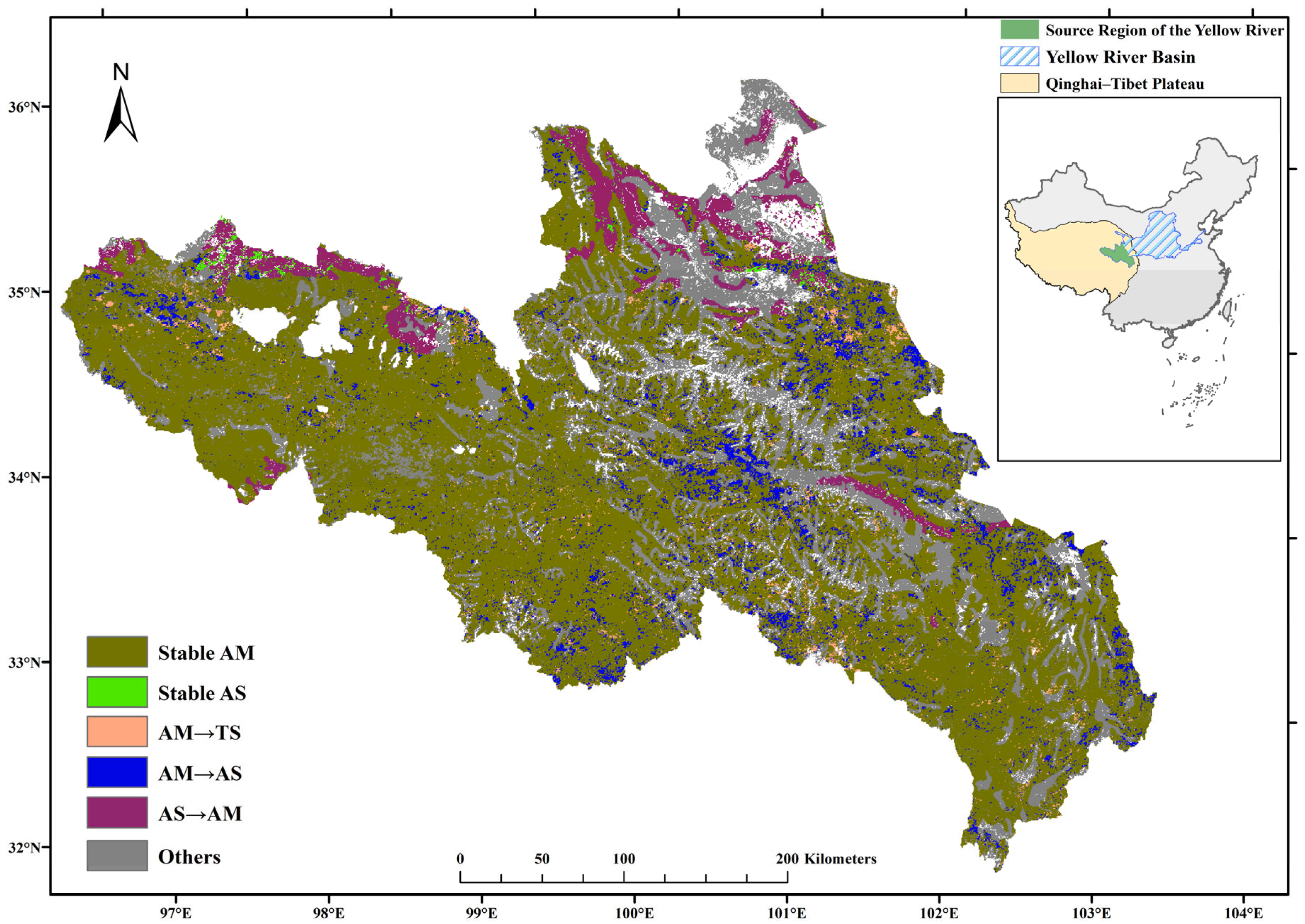 - Wu, F.; Ren, H.; Zhou, G. The 30 m vegetation maps from 1990 to 2020 in the Tibetan Plateau. Sci. Data 2024, 11, 804. [Google Scholar] [CrossRef]