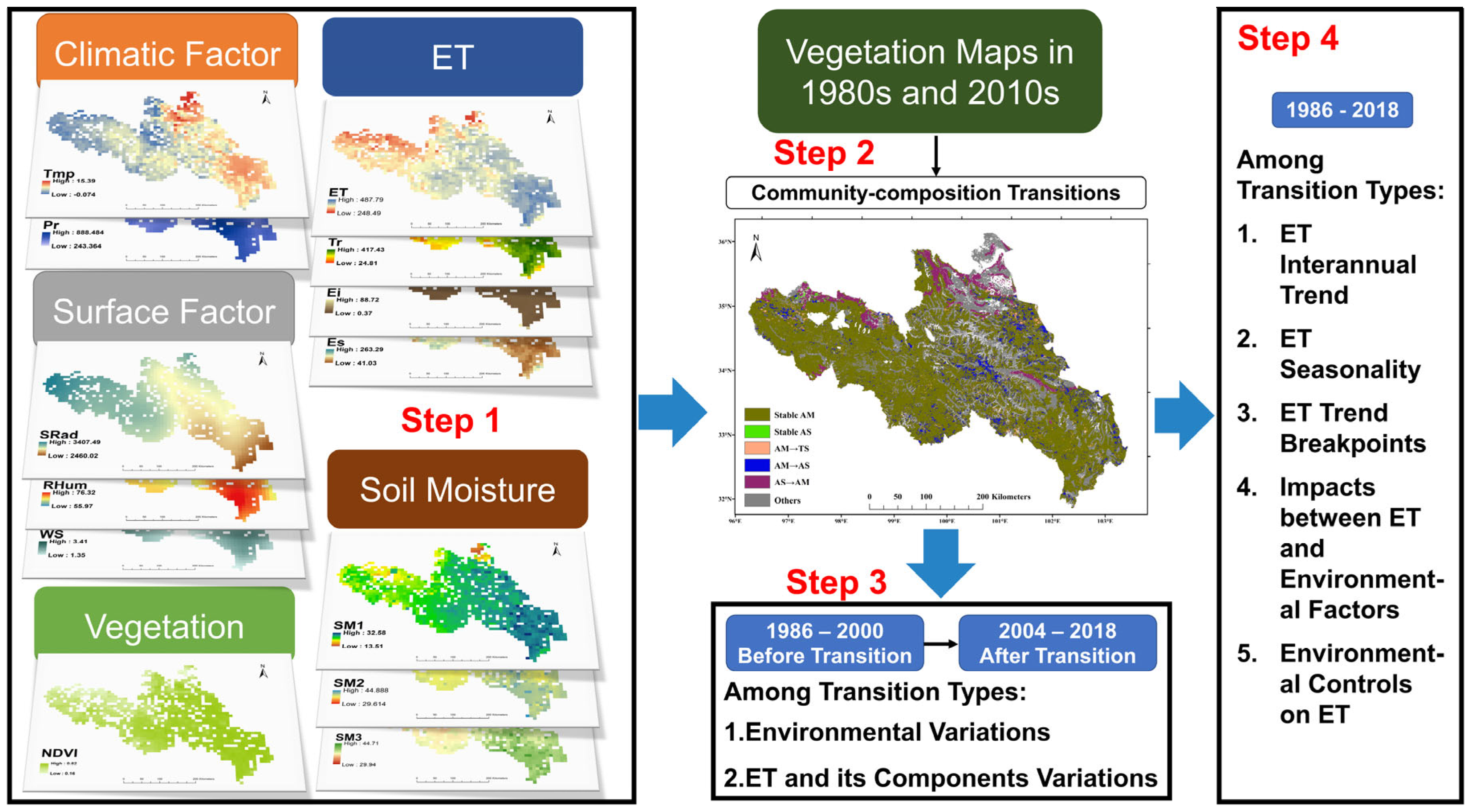 - Compositional transition directionality governs hydrological responses: temperature-driven ET (soil drying) in AM-origin vs. precipitation-driven ET (soil wetting) in AS-origin grasslands.