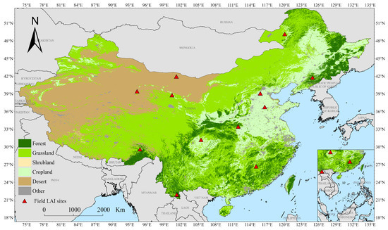 To directly validate the inverted LAI against ground-based measurements, we collected ground-based observations of LAI from 12 sites from 2022 to 2024. These data were obtained from the following three sources: (1) the National Ecosystem Science Data Center, National Science and Technology Infrastructure of China (available at http://www.nesdc.org.cn), (2) the National Tibetan Plateau Data Center (available at http://data.tpdc.ac.cn), and (3) ground-based LAI conducted by our research team using the LAI-2200 Plant Canopy Analyzer (Li-Cor Biosciences, Lincoln, NE, USA). The spatial distribution of these 12 sampling sites is illustrated in Figure 1, with detailed site information provided in Appendix A Table A1 [29].