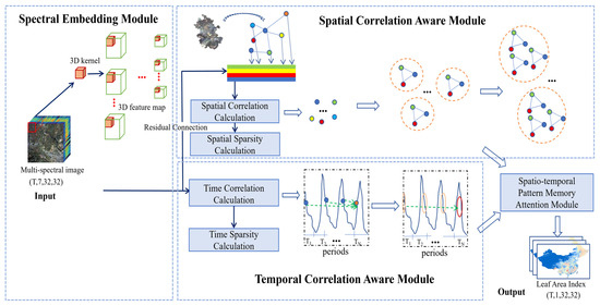 To address the limitations of existing LAI inversion methods in extracting spatial-spectral-temporal features and modeling spatio-temporal correlations, STC-DeepLAINet was proposed. As shown in Figure 2, multidimensional surface reflectance data from remote sensing imagery served as the network input, while the corresponding LAI values across China were used as the output (the time sequence length is 92 for the training phase and 46 for the validation and test phases). A spectral embedding module was designed to effectively encode spectral-spatial features. Subsequently, a spatio-temporal correlation aware module was designed to acquire spatio-temporal correlation features during vegetation growth. Furthermore, a spatio-temporal pattern memory attention module was introduced to fuse spatio-temporal features and learn global spatio-temporal dependencies. Finally, a knowledge-guided loss function was tailored to mitigate the saturation effect in LAI inversion, ultimately enabling LAI inversion at 500 m spatial resolution over China.