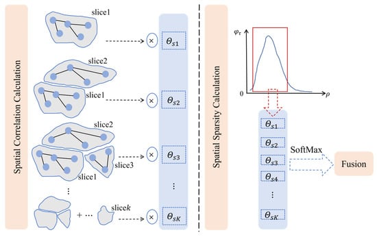 To improve the network computational efficiency, not all geospatial correlation results are fed to subsequent layers. Thus, we designed a sparsity-aware attention mechanism to selectively focus on high-correlation spatial regions. Specifically, spatial slices were first ranked in descending order according to the deviation of their geospatial correlations from a uniform distribution. As shown in Figure 4, the top K spatial slices were selected to construct the final geospatial set denoted as . Let k be a geospatial region augmented with N spatial slices. After projection into query (o), key (p), and value (q) vectors, and given as the dimensionality of each attention subspace: