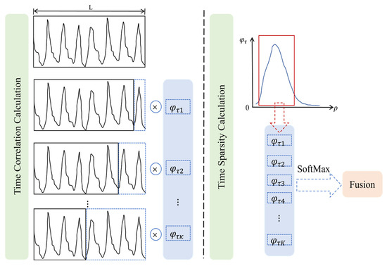 To effectively capture long-term temporal dependencies, the temporal correlation aware module (TC) was designed to capture dependencies not between isolated time points but between aggregated time periods, each composed of multiple temporally adjacent observations; this method is a type of time-series-oriented improved multi-head self-attention, which was based on the fact that vegetation phenology and LAI dynamics are typically governed by continuous growth phases rather than discrete timestamps [35,36]. Its process, analogous to that described in Equations (5) to (9), calculates temporal sparsity to identify the top K most relevant time periods for temporal correlation analysis. Consequently, both temporal correlation computation and temporal sparsity computation were integrated into the TC, enabling the network to learn high-level temporal features from a period-based perspective (Figure 5). This architecture made period-based modeling both biologically and practically meaningful.