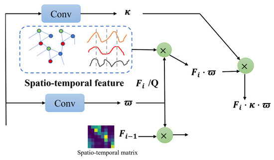 where and are learnable parameters, is the bias term, denotes the sigmoid activation function, and Z acts as the gating variable to control the contribution of temporal and spatial features during fusion. This adaptive gating mechanism allows the MAN to dynamically emphasize informative spatio-temporal characteristics learned from historical memory. Within the multi-head attention mechanism, the query vector Q is replaced with the fused spatio-temporal feature , enabling the network to attend more effectively to historically similar spatio-temporal patterns. The output of the MAN was computed as:
