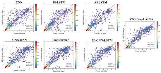 - The spatio-temporal correlation-aware deep learning network for LAI inversion, STC-DeepLAINet, outperforms eight widely used machine learning methods as well as state-of-the-art deep learning methods across all three quantitative metrics: R2, RMSE, and bias.