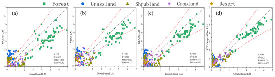 - Fang, H.L.; Zhang, Y.H.; Wei, S.S.; Li, W.J.; Ye, Y.C.; Sun, T.; Liu, W.W. Validation of global moderate resolution leaf area index (LAI) products over croplands in northeastern China. Remote Sens. Environ. 2019, 233, 111377. [Google Scholar] [CrossRef]