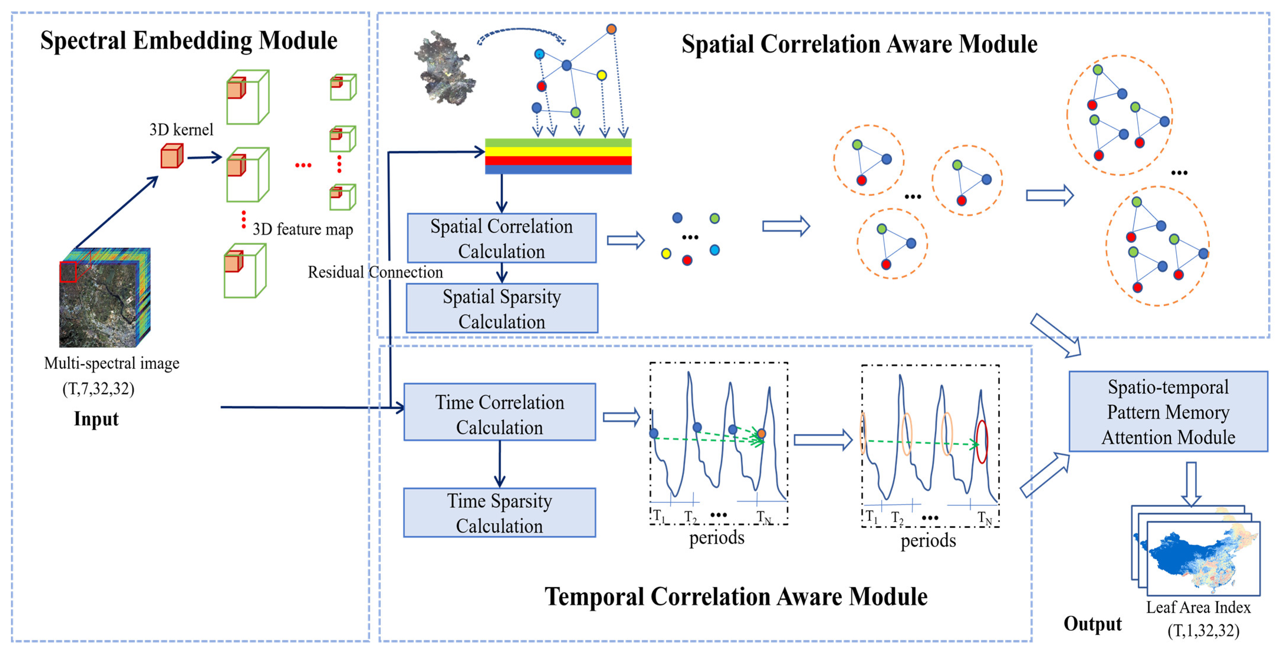 - An attention-driven spatio-temporal pattern memory mechanism was designed to adaptively retrieve and leverage historically similar patterns while fusing spatio-temporal features, thereby improving LAI inversion accuracy and making it particularly suitable for complex vegetation ecosystems.