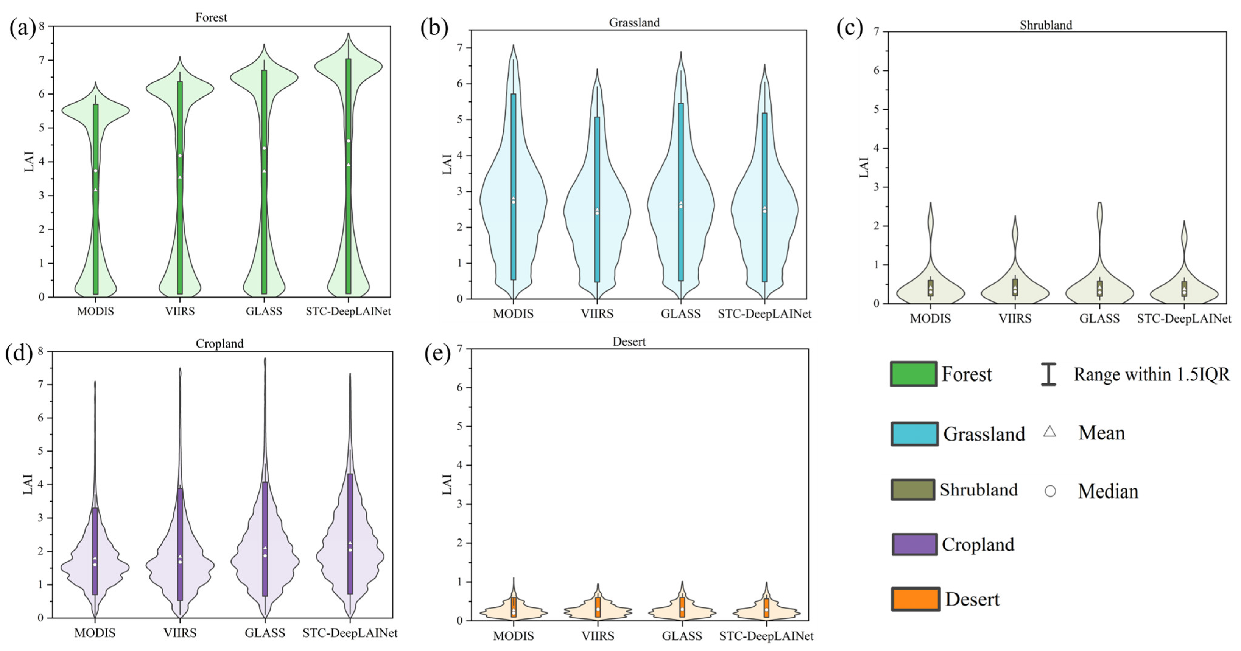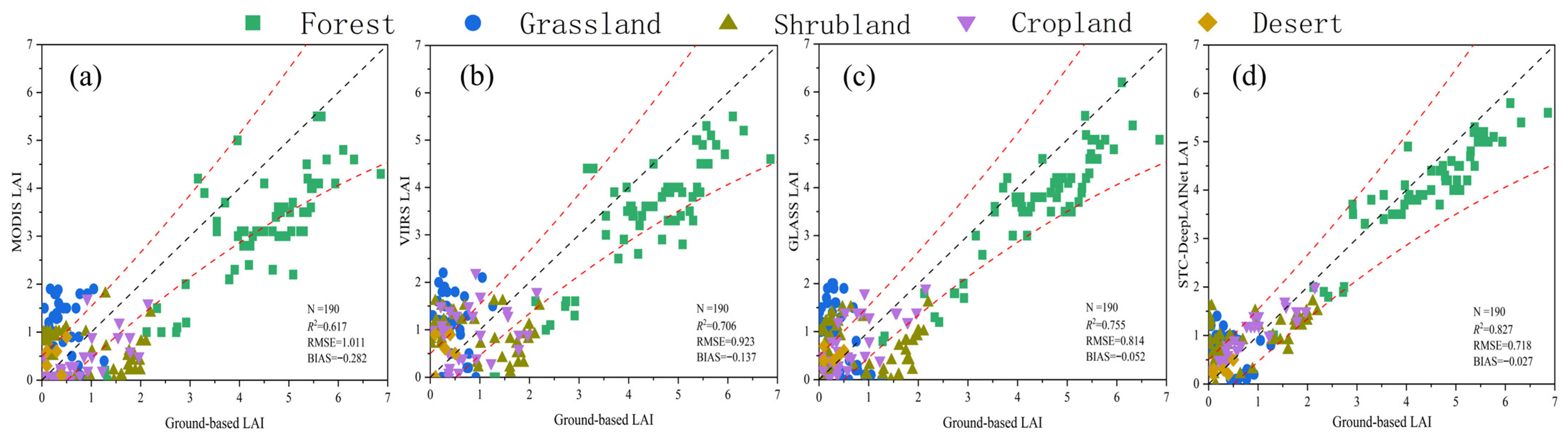 - Compared to the mainstream GLASS LAI product (prone to saturation in high LAI scenarios), STC-DeepLAINet generates LAI products with superior consistency with ground-based measurements, addressing a critical limitation of existing LAI inversion products.