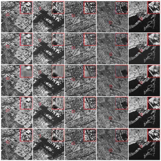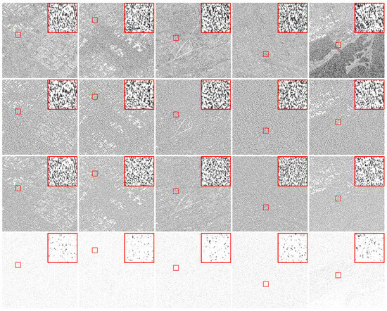 SAR and filtered images. From top to bottom: SAR (SLC level), Filtered with AE, FANS, Monet, and SCUNet. Zoom of regions of interest in the red bounding boxes.