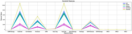 Due to their ability to quantify textural patterns, Haralick features have been widely adopted in image analysis tasks across diverse domains, including medical imaging [32,33,34,35], remote sensing [36,37,38,39], and industrial inspection [40,41,42,43]. The robustness of these features arises from their mathematical formulation, which encapsulates texture properties in a compact quantitative representation while maintaining sensitivity to variations in image structure.