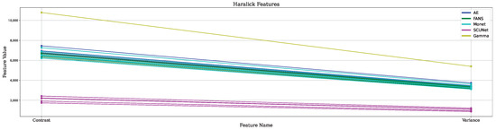 First, fourteen Haralick features were obtained from all the five samples despeckled with five filters. Also, the same features of the pure gamma images was obtained. These results are shown in Figure 4.