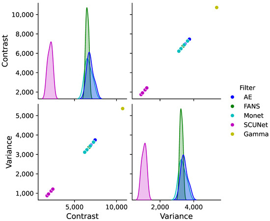 From a discriminative perspective, SCUNet and gamma occupy distinct regions in the space, allowing clear differentiation from the other filters. Conversely, AE, FANS, and Monet overlap considerably, making them less distinguishable using only these two descriptors. This observation highlights the trade-off between smoothing strength and texture preservation: SCUNet favors maximum denoising at the expense of fine details, while AE, FANS, and Monet achieve a more balanced compromise.